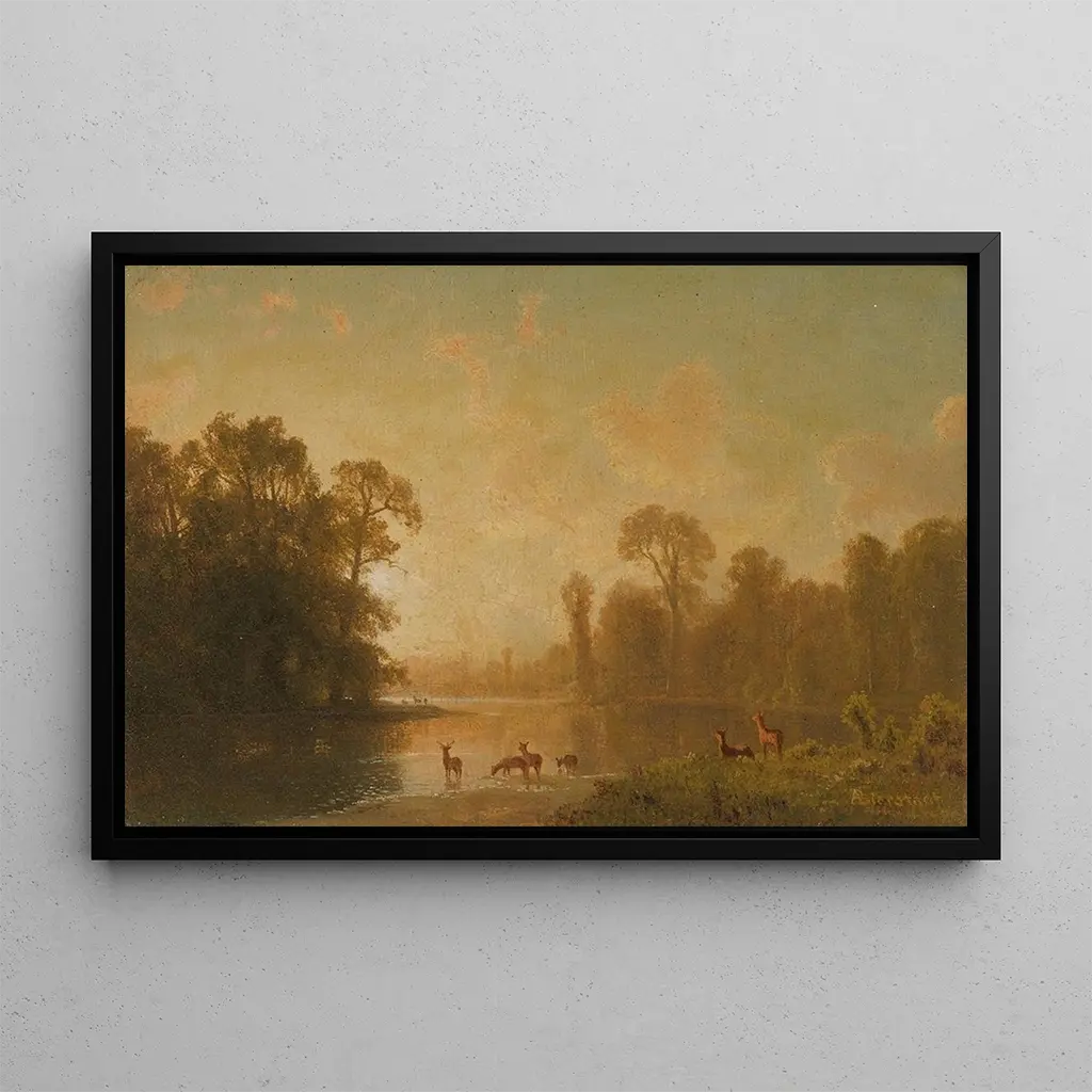 In diesem faszinierenden Werk entführt uns Albert Bierstadt in das Herz einer majestätischen Landschaft, in der die Dämmerung die Szene mit einer sanften Melancholie umhüllt. Die Hirsche, elegante Silhouetten, bewegen sich anmutig durch einen von goldenem Licht durchfluteten Wald. Die warmen Farben und die zarten Nuancen des Himmels verschmelzen harmonisch mit den dunkleren Tönen der Bäume und schaffen eine Atmosphäre, die sowohl ruhig als auch geheimnisvoll ist. Die Technik von Bierstadt, geprägt von einem beeindruckenden Realismus und einer sorgfältigen Detailarbeit, lädt uns ein, die vergängliche Schönheit der Natur zu bewundern.