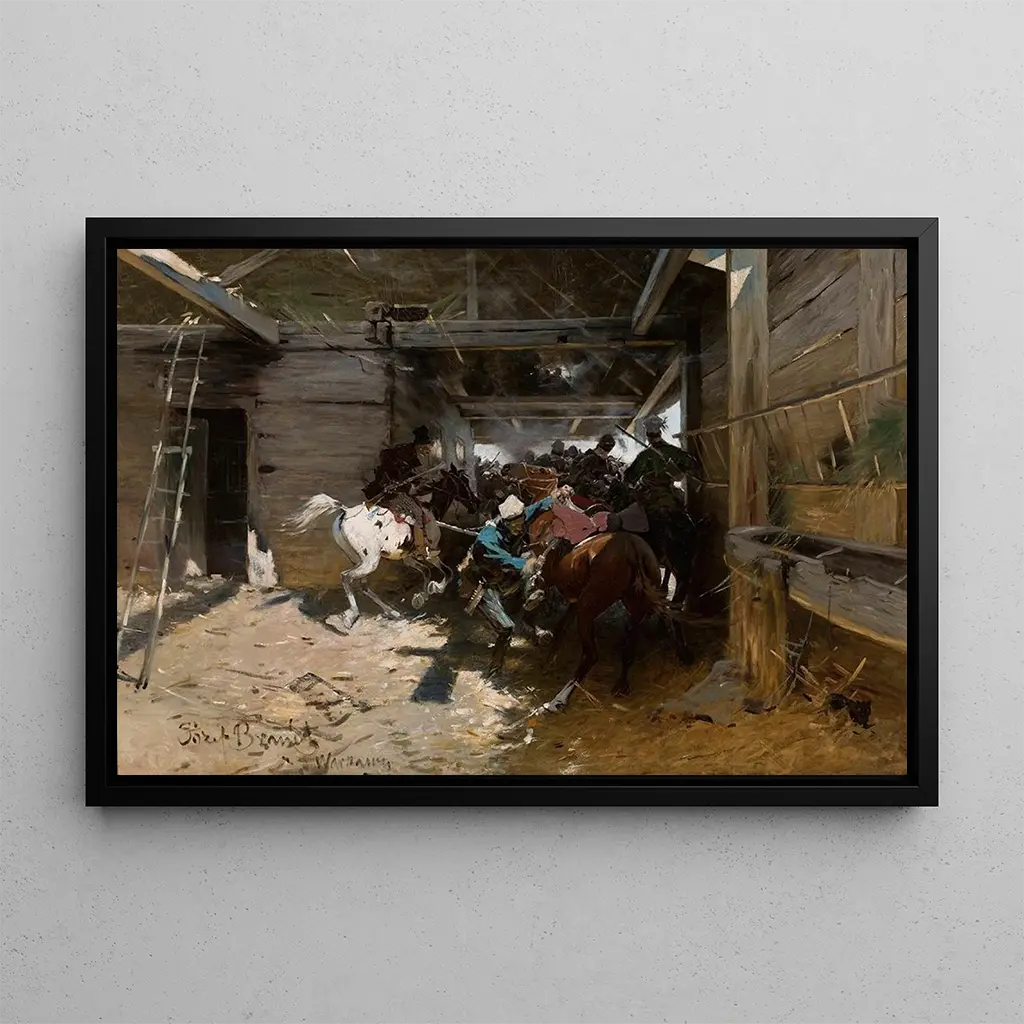Geboren 1841 in Polen, ist Józef Brandt ein anerkannter Maler, dessen Werke Szenen des polnischen Lebens und historische Schlachten darstellen. Beeinflusst vom Romantizismus und Realismus, hat er es verstanden, das Wesen seiner Zeit durch lebendige und emotional aufgeladene Gemälde einzufangen. Brandt studierte an der Kunstakademie München, wo er seinen Stil perfektionierte. Seine Arbeiten werden oft mit der Darstellung der polnischen Noblesse und bedeutender Ereignisse in der Geschichte seines Landes in Verbindung gebracht, was ihm einen wichtigen Platz in der Kunst des 19. Jahrhunderts verschaffte.