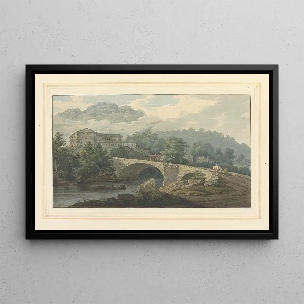 Die kunstdruck Pont de Brathay, geschaffen von Joseph Farington, entführt uns an den Rand eines friedlichen Flusses, umgeben von grünen Landschaften. Die sanften Töne von Grün und Blau vermitteln eine ruhige Atmosphäre, in der die Reflexion der Bäume im Wasser eine fesselnde visuelle Harmonie schafft. Farington, mit seiner Meisterschaft im Umgang mit Licht und Schatten, gelingt es, die Essenz dieses idyllischen Ortes einzufangen. Die Komposition, zentriert um die hölzerne Brücke, lädt zu einem imaginären Spaziergang ein und ermöglicht dem Betrachter, in diese bucolic Szene einzutauchen. Jedes Detail, von den Blättern bis zu den Wolken, trägt zur ruhigen Stimmung dieses Werks bei.