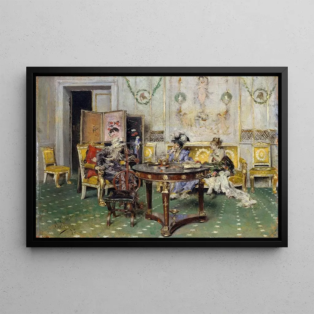 In "Commérages" fängt Giovanni Boldini das Wesen einer Epoche mit unvergleichlicher Meisterschaft ein. Das Gemälde zeigt eine lebhafte Szene, in der elegant gekleidete Figuren sich in lebhaften Austausch befinden. Die leuchtenden Farben und die flüssigen Pinselstriche verleihen eine Atmosphäre von Dynamik und Raffinesse. Die feinen Details der Kostüme und Gesichter zeugen von einer sorgfältigen Beachtung von Licht und Schatten, wodurch eine Tiefe entsteht, die den Blick anzieht. Dieses Werk ist eine wahre Einladung, in die soziale Welt der Belle Époque einzutauchen, in der jede Figur eine Geschichte zu erzählen scheint.