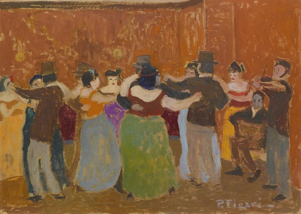 In "Le Cabaret Tango" taucht Pedro Figari in die lebendige und leidenschaftliche Welt des argentinischen Tangos ein. Die Figuren, gekleidet in auffällige Kostüme, scheinen unter dem Pinselstrich des Künstlers zum Leben zu erwachen, während die warmen Farben und dynamischen Formen die Musik und Bewegung widerspiegeln. Figari gelingt es mit seiner Ölmaltechnik, die Energie und Sinnlichkeit dieses ikonischen Tanzes einzufangen und eine festliche und bezaubernde Atmosphäre zu schaffen, die den Betrachter in das Herz der argentinischen Kultur entführt.