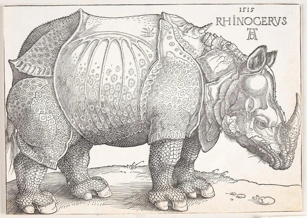 Der Rhinocéros von Albrecht Dürer ist ein ikonisches Kunstwerk, das durch seine beeindruckende Realitätsnähe und Detailgenauigkeit fasziniert. Erschaffen im Jahr 1515, zeigt diese Holzschnitt-Druck eine exotische und mysteriöse Kreatur für die damalige Zeit, mit einer reichen Textur und zarten Schatten, die der Szene Leben einhauchen. Die präzisen Linien und die Kontraste von Licht und Schatten schaffen eine majestätische und zugleich faszinierende Atmosphäre, die den Betrachter dazu einlädt, über die Natur dieses faszinierenden Wesens nachzudenken. Die Komposition, obwohl statisch, vermittelt ein Gefühl von Kraft und Stärke und offenbart gleichzeitig die Neugier des Künstlers für die natürliche Welt.