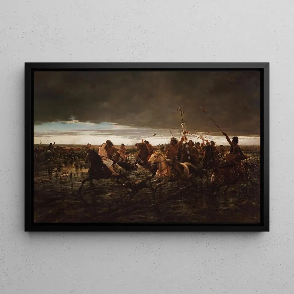 Le Retour du Malón : eine Epopöe von Tapferkeit und Nostalgie Die kunstdrucke Le Retour du Malón von Ángel Della Valle entführen uns in einen emotional aufgeladenen Moment, in dem heroische Silhouetten von Reitern nach einer Expedition nach Hause zurückkehren. Die warmen Erdtöne und die goldenen Himmelsschattierungen schaffen eine dramatische Atmosphäre, verstärkt durch die dynamische Bewegung der Pferde. Die Technik von Della Valle, die Realismus und Romantik verbindet, fängt das Wesen dieser triumphalen Rückkehr ein und evoziert gleichzeitig eine spürbare Melancholie. Jedes Detail, von den Gesichtsausdrücken der Figuren bis zu den Landschaftselementen, erzählt eine Geschichte von Mut und Verlust. Ángel Della Valle: ein Zeuge der argentinischen Geschichte Ángel Della Valle, argentinischer Maler des 19. Jahrhunderts, ist bekannt für seine Darstellungen der Kultur und Geschichte seines Landes. Beeinflusst von der romantischen Bewegung, interessiert er sich besonders für die Themen Krieg und Natur. Seine Werke, oft inspiriert von indigenen Traditionen und historischen Kämpfen, zeugen von einer Zeit des Umbruchs in Argentinien. Della Valle konnte den Geist seiner Zeit einfangen und wurde zu einer bedeutenden Figur in der lateinamerikanischen Kunstszene, deren Einfluss noch heute spürbar ist. Eine dekorative anschaffung mit vielfältigen vorteilen Der kunstdruck des Gemäldes Le Retour du Malón ist eine faszinierende Ergänzung Ihrer Inneneinrichtung, sei es im Wohnzimmer, Büro oder Schlafzimmer. Seine visuelle Intensität und seine reiche Geschichte verleihen Ihrem Raum eine einzigartige Tiefe. Die Qualität des kunstdrucks garantiert eine bemerkenswerte Treue zu den Details des Originalwerks von Ángel Della Valle, sodass Sie sein Talent voll und ganz genießen können. Mit seiner starken ästhetischen Anziehungskraft wird dieses Leinwandbild zum Blickfang Ihrer Dekoration, das Bewunderung und Gespräche über Kunst und Geschichte anregt.