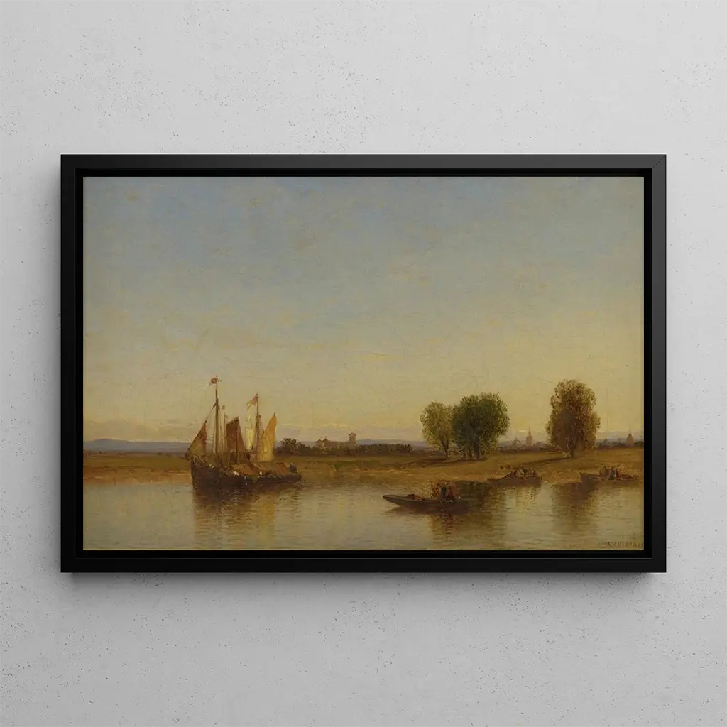 Die Leinwand "Eine Flusslandschaft in Italien" von Samuel Colman zeigt eine friedliche Szene, in der die Natur in ihrer ganzen Pracht erstrahlt. Die sanften und leuchtenden Farben, die von strahlendem Grün bis zu beruhigendem Blau reichen, schaffen eine Atmosphäre der Ruhe. Die Technik von Colman, die gekonnt Ölmalerei mit Lichtakzenten verbindet, erweckt diese idyllische Landschaft zum Leben. Die Reflexionen im Wasser, die majestätischen Bäume und die sanft gewellten Hügel laden zu einer meditativen Betrachtung ein und entführen den Betrachter auf eine visuelle Reise ins Herz Italiens.