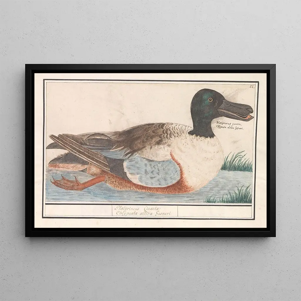 Canard souchet Anas clypeata : eine natürliche Eleganz am Wasserufer Die kunstdruck des "Canard souchet Anas clypeata" von Anselmus Botius de Boodt ist eine wahre Hommage an die ornithologische Schönheit. Dieses Gemälde, reich an Details, fängt die Eleganz dieses Entenvogels mit markantem Gefieder ein. Die zarten Farbtöne von Grün und Braun verschmelzen harmonisch, während der aquatische Hintergrund eine ruhige natürliche Umgebung evoziert. Die Präzision der Linien und die Feinheit der Texturen schaffen eine lebendige, fast fühlbare Atmosphäre, die den Betrachter einlädt, die Anmut dieses Vogels zu bewundern. Dieses Werk ist ein perfektes Beispiel dafür, wie kunst die Tier- und Pflanzenwelt feiern kann. Anselmus Botius de Boodt : ein Blick auf die Natur im 17. Jahrhundert Anselmus Botius de Boodt, flämischer Künstler des 17. Jahrhunderts, ist bekannt für seine akribischen Darstellungen von Tieren und Pflanzen. Sein Werk ist in eine naturalistische Tradition eingebunden, bei der die präzise Beobachtung der Natur oberste Priorität hat. Beeinflusst von den wissenschaftlichen Fortschritten seiner Zeit, verstand er es, Kunst und Wissenschaft zu verbinden, und erfasste die Schönheit der Arten mit bemerkenswerter Strenge. Seine Werke, oft im Auftrag von Sammlern entstanden, zeugen von der Bedeutung der Darstellung der Natur in der Kunst der Renaissance, und der "Canard souchet" ist ein perfektes Beispiel dafür. Eine dekorative Anschaffung mit vielfältigen Vorzügen Der kunstdruck des "Canard souchet Anas clypeata" ist ein dekoratives Stück, das Ihr Interieur bereichern wird, sei es im Büro, Wohnzimmer oder Schlafzimmer. Die Druckqualität garantiert eine Treue zu den Farben und Details des Originalwerks und verleiht Ihrer Dekoration eine elegante Note. Dieses Gemälde, mit seiner natürlichen Atmosphäre, evoziert die Ruhe der aquatischen Lebensräume und lädt zur Betrachtung ein. Mit dieser Leinwand treffen Sie die Wahl für eine raffinierte Dekoration, die gleichzeitig die Schönheit der wilden Tierwelt feiert.