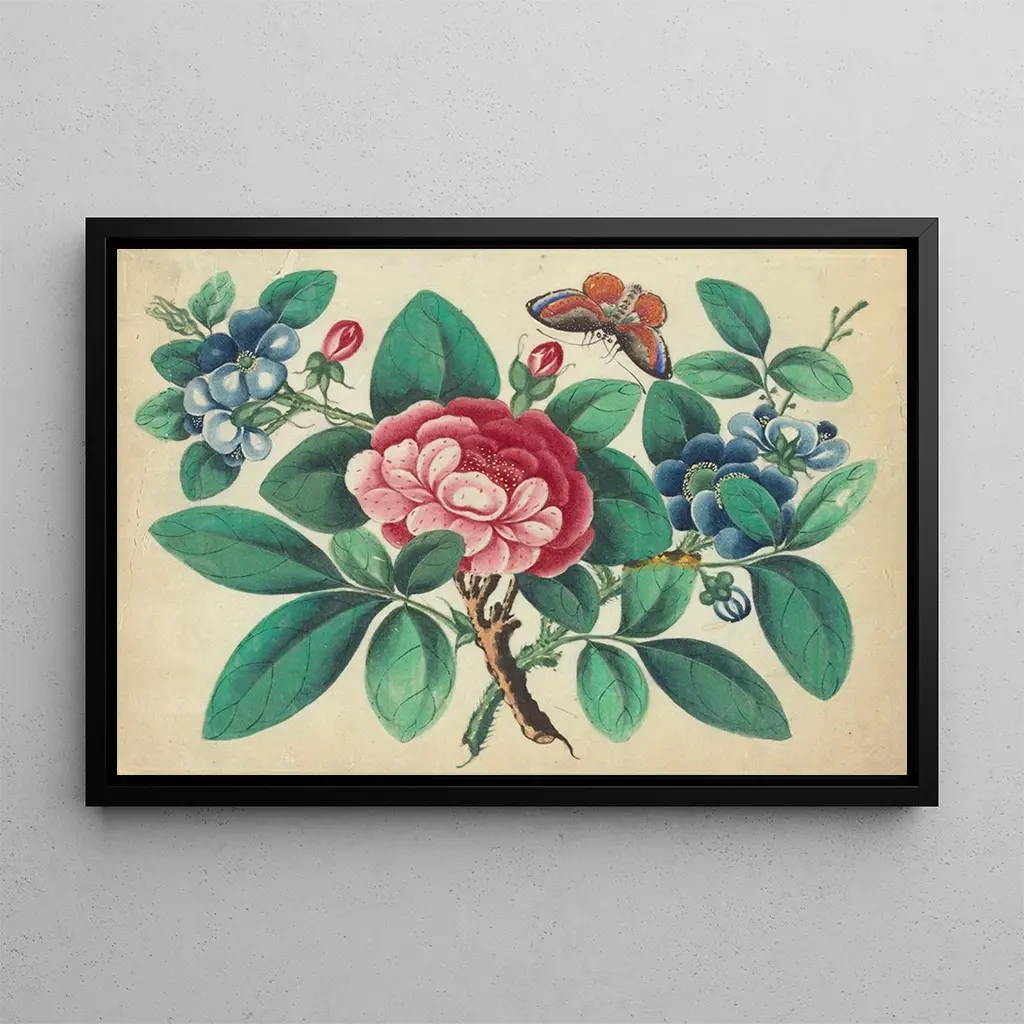 Große Rote Blume, Blaue Blumen, Schmetterling - Anonym