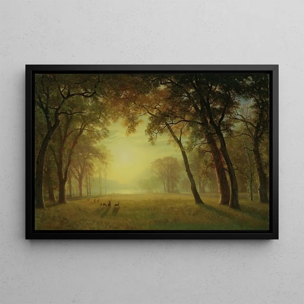 Cerfs dans une Clairière à Yosemite : eine Harmonie zwischen Natur und Gelassenheit In "Cerfs dans une Clairière à Yosemite" fängt Albert Bierstadt die Majestät der amerikanischen Landschaften mit beeindruckender Feinfühligkeit ein. Das Leinwandbild, durchdrungen von goldenem Licht, zeigt friedlich versammelte Hirsche in einer grünen Lichtung, umgeben von majestätischen Bergen. Die Nuancen von Grün und Braun vermitteln eine Atmosphäre der Ruhe, während Licht- und Schatteneffekte der Szene eine fast mystische Tiefe verleihen. Die Technik von Bierstadt, geprägt von einem akribischen Realismus und Liebe zum Detail, lädt den Betrachter ein, in diese unberührte Natur einzutauchen, in der jedes Element zu pulsieren scheint. Albert Bierstadt: ein Pionier der amerikanischen Landschaftsmalerei Albert Bierstadt, aktiv im 19. Jahrhundert, zählt zu den führenden Vertretern der Kunstbewegung, bekannt als die Hudson River School. Beeinflusst von seinen Reisen in Europa und seiner Bewunderung für die grandiosen Landschaften des amerikanischen Westens, verstand er es, die natürliche Schönheit in spektakuläre Kunstdrucke umzusetzen. Seine Gemälde, oft in großem Format, spiegeln eine romantische und idealisierte Sicht auf die Natur wider und zeugen vom wachsenden Bewusstsein für die Umwelt in der amerikanischen Gesellschaft seiner Zeit. Bierstadt spielte eine entscheidende Rolle bei der Förderung amerikanischer Landschaften und trug dazu bei, die nationale Identität durch die Kunst zu formen. Eine dekorative Kunstdruck-Reproduktion mit vielfältigen Vorzügen Die Reproduktion von "Cerfs dans une Clairière à Yosemite" ist eine ideale Wahl, um Ihre Inneneinrichtung zu bereichern, sei es im Wohnzimmer, Büro oder Schlafzimmer. Mit ihrer beruhigenden Farbpalette und dem fesselnden Motiv bringt dieses Kunstwerk einen Hauch von Natur und Gelassenheit in Ihren Raum. Die Qualität der Kunstdruck-Reproduktion garantiert eine bemerkenswerte Treue zu den Details des Originalwerks, sodass Sie die ästhetische Anziehungskraft von Bierstadt im Alltag genießen können. Durch die Integration dieses Leinwandbildes in Ihre Dekoration laden Sie nicht nur die natürliche Schönheit in Ihr Zuhause ein, sondern auch ein Stück künstlerischer Geschichte, das Ihre Gäste begeistern wird.