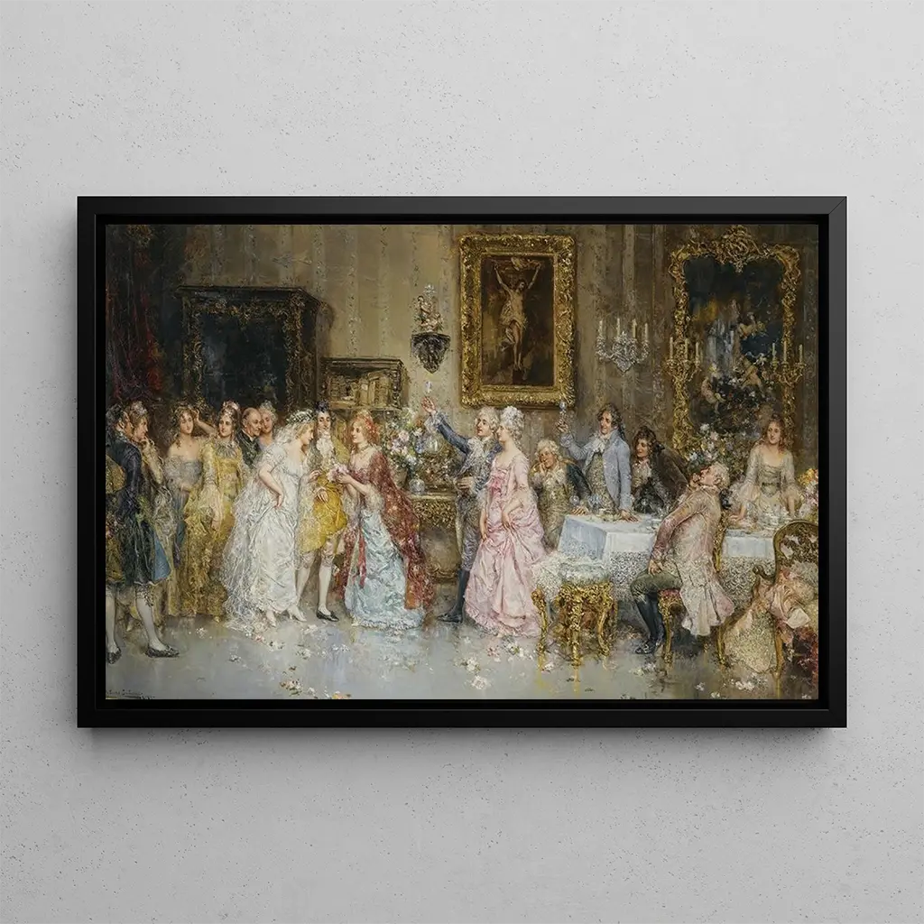 Le Banquet nuptial : eine Feier des Lebens und der Liebe Der Hochzeitsbankett von Juan Pablo Salinas ist ein lebendiges Werk, das Freude und Intimität einer Feier evoziert. Die warmen und leuchtenden Farben, wie tiefe Rottöne und strahlende Goldtöne, verschmelzen zu einer festlichen und einladenden Atmosphäre. Die dynamische Komposition, bei der sich die Figuren in einem Tanz der Geselligkeit verflechten, zieht sofort den Blick auf sich und lädt zur Betrachtung ein. Die Technik von Salinas, die Realismus und impressionistische Akzente verbindet, erweckt die Details zum Leben, von lächelnden Gesichtern bis hin zu kunstvoll präsentierten Speisen auf dem Tisch. Jedes Element scheint eine Geschichte zu erzählen und versetzt den Betrachter in die Lebendigkeit eines geteilten Moments. Juan Pablo Salinas : ein Meister des lateinamerikanischen Realismus Juan Pablo Salinas, Künstler lateinamerikanischer Herkunft, hat die Essenz der Kultur und Traditionen seiner Zeit durch seine Werke eingefangen. Geboren zu Beginn des 20. Jahrhunderts, wurde er von europäischen Kunstbewegungen beeinflusst, während er Elemente seines kulturellen Erbes integrierte. Salinas entwickelte sich in einem Kontext, in dem Kunst ein Mittel war, lokale Identitäten und Geschichten auszudrücken, was ihn durch seinen einzigartigen Stil auszeichnete. Das Hochzeitsbankett zeugt von dieser Verschmelzung zwischen Klassizismus und Moderne und feiert gleichzeitig die gemeinschaftlichen und familiären Werte, die seiner Kultur am Herzen liegen. Eine dekorative anschaffung mit vielfältigen vorteilen Der kunstdruck des Hochzeitsbankett ist ein ideales Dekorationsstück, um Ihr Interieur zu bereichern, sei es im Wohnzimmer, Büro oder Schlafzimmer. Seine Druckqualität garantiert eine bemerkenswerte Treue zu den Farben und Details des Originals, sodass Sie das Werk genießen können, als stünden Sie vor dem Original. Mit seiner ästhetischen Anziehungskraft wird diese Leinwand zu einem faszinierenden Blickfang, der Gespräche anregt und Emotionen weckt. Dieses Werk zu verschenken oder sich selbst zu schenken, bedeutet, die Magie eines festlichen Moments in Ihren Alltag zu holen und gleichzeitig eine elegante Note in Ihre Innendekoration zu bringen.