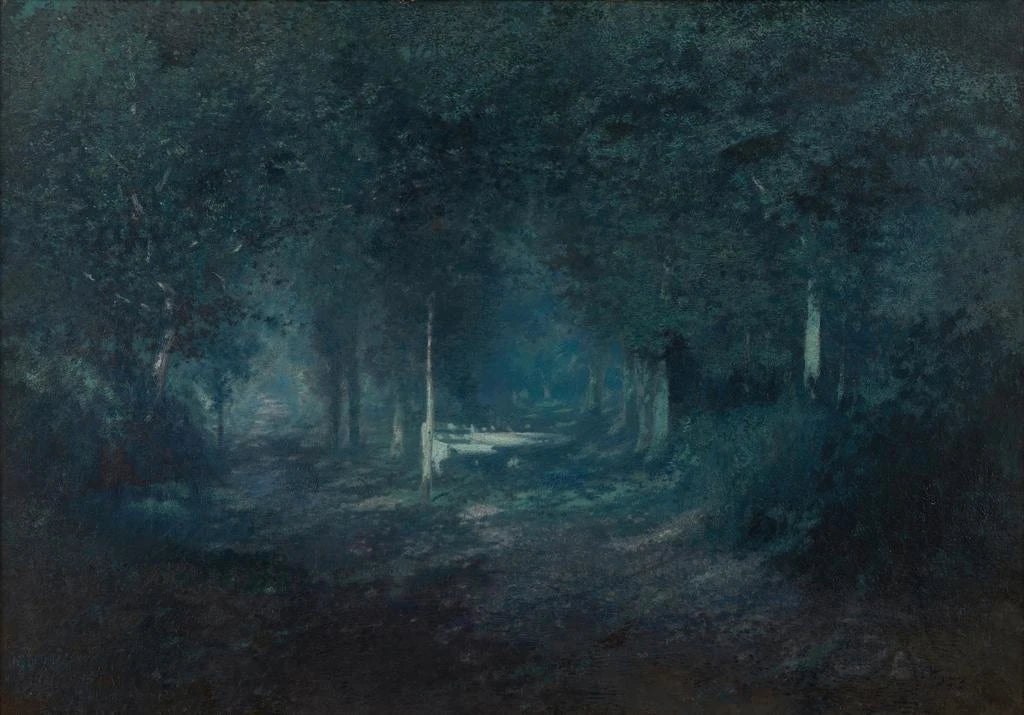 Bois au clair de lune, ein werk von Adrien Joseph Heymans, evoziert eine nächtliche szene voller geheimnis und poesie. Die leinwand zeigt eine waldlandschaft, die vom silbernen licht des mondes erleuchtet wird, wo die bäume majestätisch emporragen. Die nuancen von blau und schwarz vermischen sich subtil und schaffen eine atmosphäre, die sowohl ruhig als auch bezaubernd ist. Die technik von Heymans, mit ihren flüssigen pincelstrichen und ihrer meisterschaft im umgang mit licht, erweckt diese nächtliche szene zum leben und lädt den betrachter ein, die tiefen des waldes zu erkunden. Jedes detail, von funkelnden blättern bis zu tanzenden schatten, trägt zu einer magischen und kontemplativen atmosphäre bei.