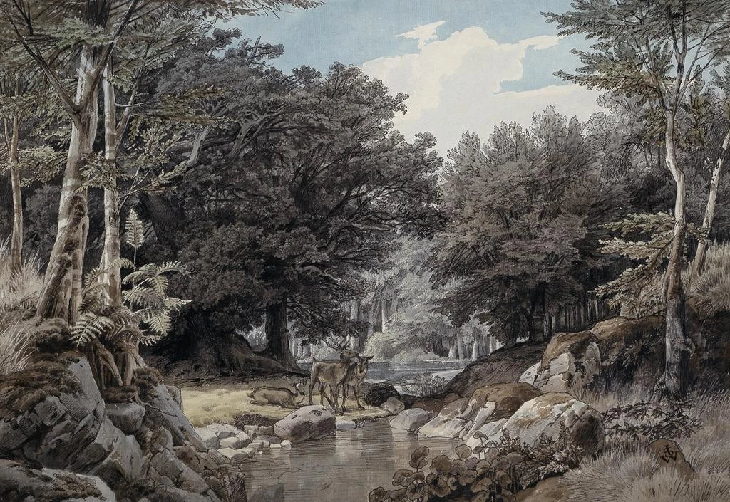 Waldinneres mit Hirschen in der Nähe des Wassers - Johann Wilhelm Schirmer