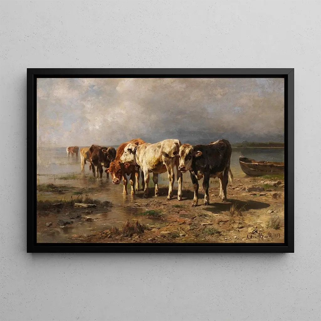 Vaches am Ufer des Sees: eine idyllische Szene voller Gelassenheit Die kunstdruck Vaches au bord du lac von Anton Braith vermittelt eine ländliche Ruhe, in der Natur und Tier in perfekter Harmonie aufeinandertreffen. Dieses Gemälde, das mit zarten Pinselstrichen geschaffen wurde, hebt sanfte und beruhigende Farbtöne hervor, die an die grünen Landschaften der Landschaft erinnern. Die Kühe, friedlich in der Nähe des Wassers platziert, scheinen einen Moment der Ruhe zu genießen und schaffen eine Atmosphäre von Gelassenheit und Kontemplation. Das Werk lädt zu einer Flucht in natürliche Räume ein, fernab vom urbanen Trubel, und feiert die schlichte Schönheit des Lebens auf dem Land. Anton Braith: ein Maler der Natur und der Tiere Anton Braith, ein deutscher Maler des 19. Jahrhunderts, ist bekannt für seine realistischen Darstellungen von Natur und Tieren. Aufgewachsen in einer ländlichen Umgebung, entwickelt er schon in jungen Jahren eine Leidenschaft für die Fauna und Flora, die zum roten Faden seines Werks wird. Beeinflusst von der romantischen Bewegung, sucht Braith, die Schönheit der natürlichen Welt mit bemerkenswerter Präzision und Sensibilität einzufangen. Der kunstdruck Vaches au bord du lac ist emblematisch für seinen Stil, der Realismus und Poesie vereint und gleichzeitig die Bedeutung der Natur in der Kunst seiner Zeit unterstreicht. Eine dekorative Anschaffung mit vielfältigen Vorzügen Der kunstdruck des Gemäldes Vaches au bord du lac ist eine perfekte Wahl, um Ihr Zuhause zu verschönern. Ob im Wohnzimmer, Esszimmer oder Büro – dieses Bild bringt einen Hauch von Natur und Ruhe in Ihren Raum. Die Druckqualität garantiert eine detailgetreue Wiedergabe, die es ermöglicht, die Schönheit der Farben und Texturen voll zu genießen. Durch die Integration dieses Werks in Ihren Raum schaffen Sie eine beruhigende Atmosphäre, die zur Entspannung und Kontemplation einlädt. Dieser kunstdruck ist nicht nur eine dekorative Ergänzung, sondern auch eine Hommage an die Schönheit der ländlichen Welt und die Schlichtheit des Lebens.