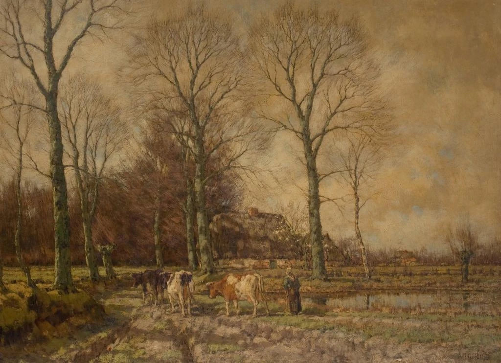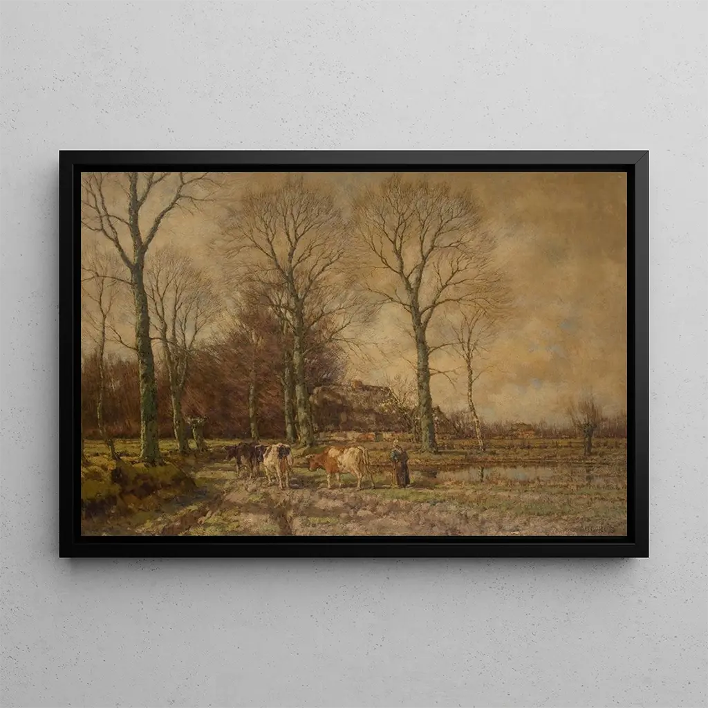 Arnold Marc Gorter, niederländischer Maler des 19. Jahrhunderts, ist bekannt für seine Fähigkeit, die Schönheit der Landschaften seines Landes einzufangen. Beeinflusst von der realistischen Bewegung, folgt er einer künstlerischen Tradition, die die getreue Darstellung der Natur schätzt. Gorter wurde auch von der Schule von Den Haag geprägt, die die direkte Beobachtung alltäglicher Szenen förderte. Seine Werke, oft geprägt von Licht und Farbe, zeugen von tiefem Respekt für die ländliche Umwelt und das Leben der Landwirte. Dieses Gemälde, wie viele andere, zeigt sein Engagement, die Schönheit niederländischer Landschaften zu verewigen.