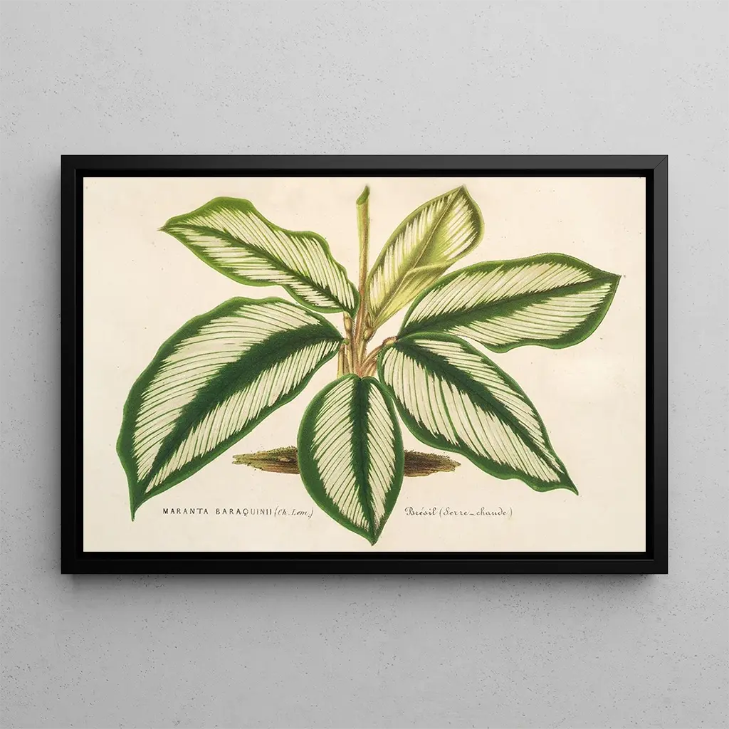 Maranta Baraquinii : eine Feier der Biodiversität Die Leinwand "Maranta Baraquinii" von Charles Antoine Lemaire präsentiert sich als wahre Feier der Biodiversität. Dieses botanische Werk, reich an Farben und Details, hebt die einzigartige Schönheit der Pflanze Maranta hervor, die für ihre faszinierenden Muster auf den Blättern bekannt ist. Die lebendigen Töne von Grün, Rosa und Creme verschmelzen harmonisch und schaffen eine lebendige und dynamische Atmosphäre. Lemaire gelingt es mit seiner präzisen Technik, die Essenz dieser Pflanze einzufangen und den Betrachter in die zarte Welt der Botanik eintauchen zu lassen. Charles Antoine Lemaire : ein Meister der künstlerischen Botanik Charles Antoine Lemaire, Botaniker und Künstler des 19. Jahrhunderts, ist bekannt für seine akribische Arbeit an Pflanzen. Sein wissenschaftlicher und künstlerischer Ansatz ermöglichte es ihm, Werke zu schaffen, die botanische Präzision und Ästhetik vereinen. Lemaire wurde durch die Entdeckungen seiner Zeit beeinflusst, insbesondere im Bereich der Botanik, und trug zur Dokumentation zahlreicher Pflanzenarten bei. Sein künstlerisches Erbe bleibt bedeutend, da er die Schönheit der Natur durch seine Illustrationen vermittelt hat und somit eine ikonische Figur der botanischen Kunst ist. Eine dekorative reproduktion mit vielfältigen Vorzügen Die reproduktion von "Maranta Baraquinii" ist eine ideale dekorative Wahl, um Ihren Wohnraum zu verschönern, sei es im Wohnzimmer, im Büro oder im Schlafzimmer. Die Druckqualität garantiert eine außergewöhnliche Treue zum Originalwerk, sodass jedes Detail klar erkennbar ist. Die ästhetische Anziehungskraft dieser Leinwand liegt in ihrer Fähigkeit, Frische und Natur in Ihr Zuhause zu bringen. Durch die Integration dieses Kunstwerks in Ihre Dekoration schaffen Sie eine einladende und inspirierende Atmosphäre, perfekt für Naturliebhaber.