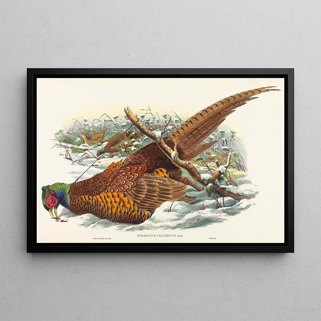 Phasianus colchicus : ein Farbklecks in der Natur Die Reproduktion von Phasianus colchicus, einem ikonischen Werk von John Gould, ruft die Pracht der Vogelwelt hervor. In diesem Gemälde verschmelzen die lebendigen Farben der Fasanenfedern harmonisch mit einem zarten Hintergrund und schaffen eine Atmosphäre, die sowohl lebendig als auch ruhig ist. Gould, Meister der ornithologischen Illustration, verwendet Gravur- und Aquarelltechniken, um jedes Detail mit bemerkenswerter Präzision einzufangen. Das Werk lädt zu einer aufmerksamen Betrachtung ein, bei der jede Farbnuance und jeder Federstrich zum Leben erwachen und den Betrachter in eine reiche und faszinierende Naturwelt entführen. John Gould : Pionier der künstlerischen Ornithologie John Gould, britischer Naturforscher und Illustrator des 19. Jahrhunderts, prägte das Gebiet der Ornithologie tiefgreifend durch seine Werke. Geboren 1804, widmete er sein Leben der Vogelstudie und reiste um die Welt, um die Vielfalt der Vogelwelt zu dokumentieren. Seine Illustrationen, oft als Meisterwerke angesehen, verbinden Wissenschaft und Kunst und spiegeln die Ästhetik seiner viktorianischen Epoche wider. Gould arbeitete mit zahlreichen Künstlern und Wissenschaftlern zusammen, was ihm ermöglichte, Werke zu schaffen, die sowohl informativ als auch visuell fesselnd sind. Sein Erbe besteht fort, und seine kunstdrucke inspirieren weiterhin Kunst- und Naturliebhaber. Eine dekorative Anschaffung mit vielfältigen Vorzügen Die Reproduktion von Phasianus colchicus ist ein ideales dekoratives Stück für jeden Raum, sei es Wohnzimmer, Büro oder Schlafzimmer. Ihre Druckqualität und die Treue zu den Originaldetails machen dieses Leinwandbild zu einer attraktiven Wahl für Kunst- und Naturliebhaber. Durch das Hinzufügen dieses Werks zu Ihrer Inneneinrichtung bringen Sie einen Hauch von Eleganz und Farbe in Ihr Zuhause und feiern gleichzeitig die Schönheit der Tierwelt. Dieses Gemälde mit seiner raffinierten Ästhetik wird Blicke auf sich ziehen und Gespräche anregen, wodurch Ihr Raum zu einem Ort der Inspiration und Kontemplation wird.