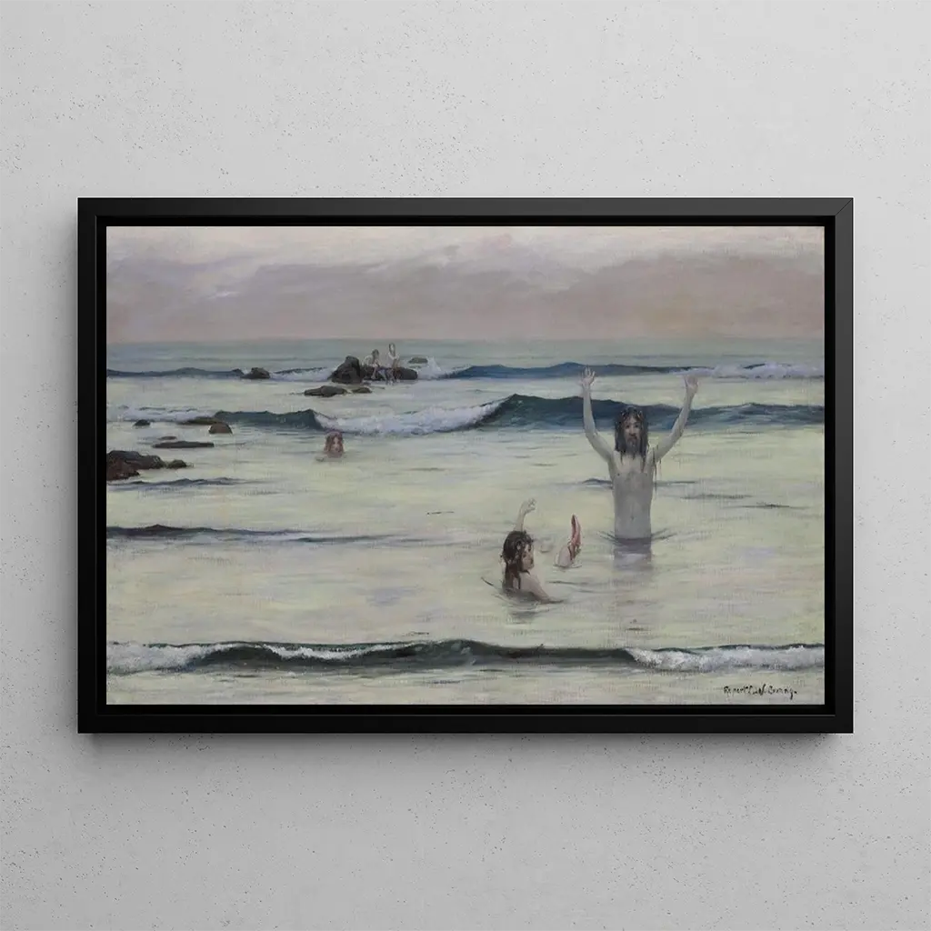 Die Leinwand "Tritons" von Rupert Bunny ist eine Feier des Meeres und seiner mythologischen Kreaturen. In diesem Werk stellt Bunny majestätische Tritonen dar, Symbole der Kraft und der anmutigen Wasserbewegung. Die lebendigen Farben und die fließenden Bewegungen der Figuren schaffen eine fesselnde Dynamik, während der Meeresgrund im Licht funkelnder Reflexe erstrahlt. Die Atmosphäre ist sowohl mystisch als auch bezaubernd und lädt den Betrachter ein, in eine Welt einzutauchen, in der Natur und Mythos aufeinandertreffen. Diese poetische Darstellung des Meeres zeugt vom Talent Bunnys, die Schönheit und das Staunen einzufangen.