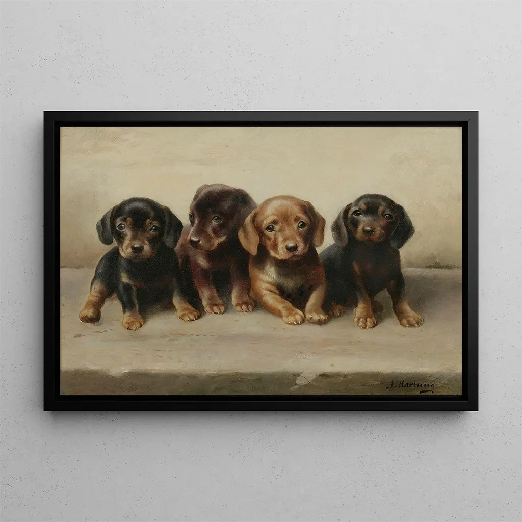 Vier Dackel-Welpen: eine tierische Zärtlichkeit Die kunstdruck von "Vier Dackel-Welpen" bietet eine herzerwärmende Sicht auf diese entzückenden kleinen Hunde. Carl Reichert, mit unbestreitbarem Talent, die Unschuld und Neugier der Tiere einzufangen, präsentiert uns diese Welpen in einer natürlichen, lebendigen Pose. Die warmen Farben und die detaillierten Fellstrukturen verstärken die Sanftheit der Szene, während die leuchtenden Augen der Welpen uns einladen, ihre Freude zu teilen. Dieses Werk ruft ein Gefühl von einfachem Glück und Verbundenheit zwischen Mensch und Tier hervor. Carl Reichert: ein Virtuose des tierischen Realismus Carl Reichert, geboren 1836, ist ein berühmter österreichischer Maler, bekannt für seine realistischen Darstellungen von Tieren. Sein Werk gehört zum Realismus, bei dem die genaue Beobachtung der Natur und des tierischen Verhaltens im Vordergrund steht. Beeinflusst von den großen Meistern seiner Zeit, hat Reichert einen einzigartigen Stil entwickelt, der die Schönheit und Persönlichkeit der Tiere hervorhebt. Seine Gemälde, wie "Vier Dackel-Welpen", zeugen von seiner Fähigkeit, Momente der Zärtlichkeit und Emotion einzufangen, und machen ihn zu einem unverzichtbaren Künstler im Bereich der tiermalerei. Eine dekorative Anschaffung mit vielfältigen Vorzügen Der kunstdruck von "Vier Dackel-Welpen" ist ein Werk, das Tierliebhaber begeistern und Ihrer Innendekoration eine warme Note verleihen wird. Ob im Spielzimmer, im Büro oder im Wohnzimmer, dieses Bild vermittelt Zärtlichkeit und Geselligkeit. Seine Druckqualität garantiert eine perfekte Wiedergabe der Details des Originalwerks, sodass Sie die ganze Schönheit dieser Welpen genießen können. Mit der Wahl dieses Leinwandbildes treffen Sie eine Entscheidung für eine Dekoration, die nicht nur Ihren Raum verschönert, sondern auch Momente des Glücks und der Verbundenheit mit Ihren vierbeinigen Begleitern hervorruft.