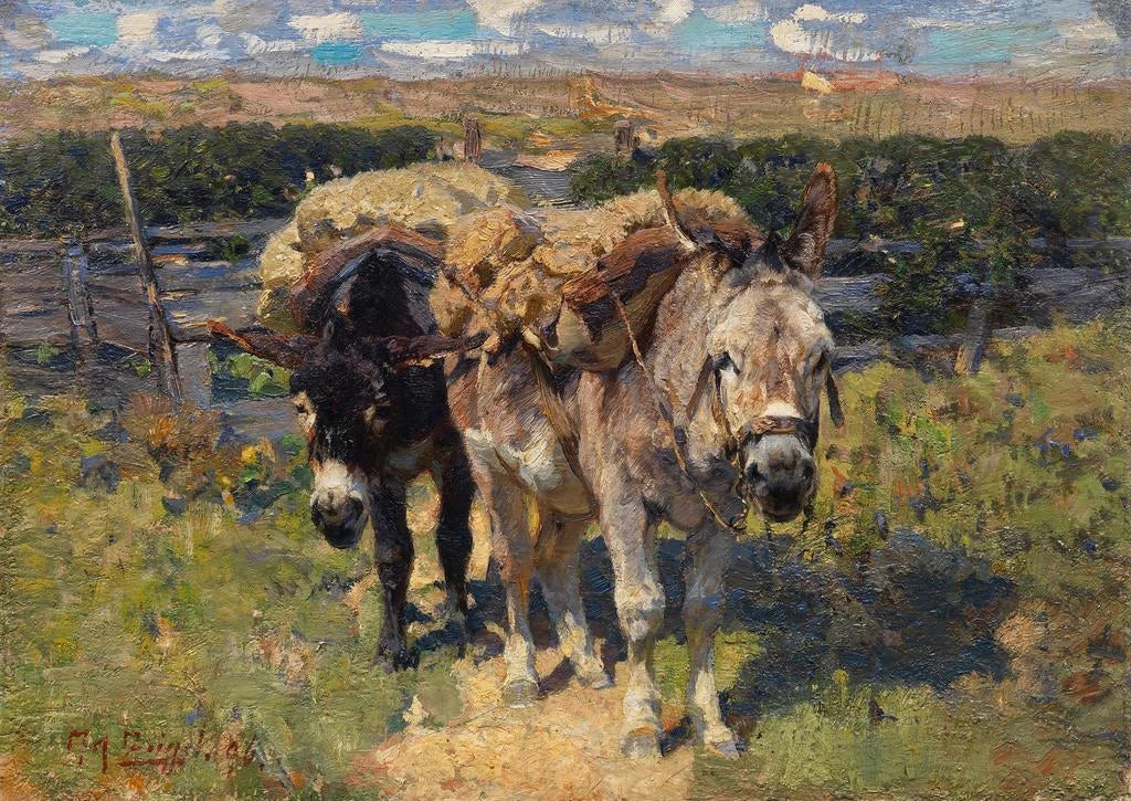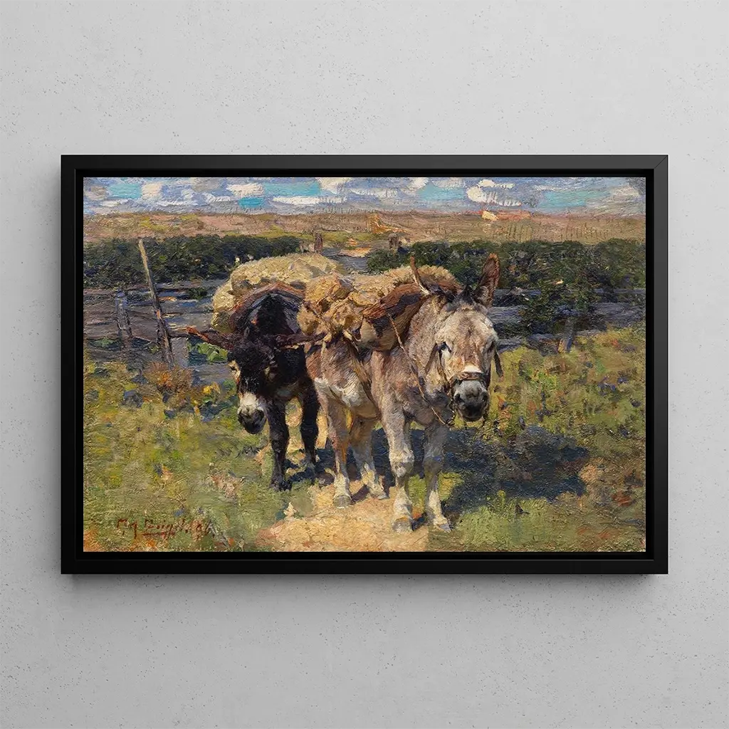 Zwei Esel: Eine idyllische Szene voller Charme „Zwei Esel“ von Heinrich von Zügel ist ein Kunstdruck, der die Einfachheit und Schönheit des Landlebens einfängt. Dieses Gemälde zeigt zwei Esel, die friedlich in einer grünen Landschaft mit wilden Blumen platziert sind. Die warmen, erdigen Farben, kombiniert mit Lichtakzenten, verleihen der Szene eine sanfte und einladende Atmosphäre. Zügel gelingt es durch sein Gespür für Details, die Ruhe der Natur und die Verbundenheit zwischen den Tieren zu vermitteln, wodurch ein Kunstdruck entsteht, der Zärtlichkeit und Gelassenheit des Landlebens widerspiegelt. Heinrich von Zügel: ein Meister der Tiermalerei Heinrich von Zügel, geboren 1850, ist bekannt für seine realistischen Darstellungen von Tieren und Landschaften. In einer künstlerischen Tradition aufgewachsen, die genaue Beobachtung schätzt, entwickelte er einen Stil, der Präzision und Empfindsamkeit vereint. Zügel wurde vom naturalistischen Bewegung beeinflusst und strebte danach, die Natur mit bemerkenswerter Treue darzustellen. Seine Karriere, die sich über das späte 19. und frühe 20. Jahrhundert erstreckt, ist geprägt von einer Reihe von Kunstdrucken, die die Schönheit von Fauna und Flora feiern. „Zwei Esel“ ist ein perfektes Beispiel für seine Fähigkeit, einfache, aber ausdrucksstarke Momente des Lebens einzufangen. Eine dekorative Kunstdruck-Edition mit vielfältigem Reiz Der Kunstdruck von „Zwei Esel“ ist eine charmante Ergänzung für jede Innendekoration, sei es im Wohnzimmer, in der Küche oder im Büro. Seine warme Atmosphäre und die idyllische Ästhetik bringen einen Hauch Natur in Ihren Wohnraum. Die Qualität des Kunstdrucks garantiert eine Treue zur Originalarbeit, sodass Sie die Schönheit von Zügel in Ihrem eigenen Zuhause genießen können. Mit diesem Gemälde verleihen Sie Ihrem Interieur ein Stück, das Freude und Kontemplation weckt, und fügen Ihrer Dekoration eine künstlerische und warme Note hinzu.
