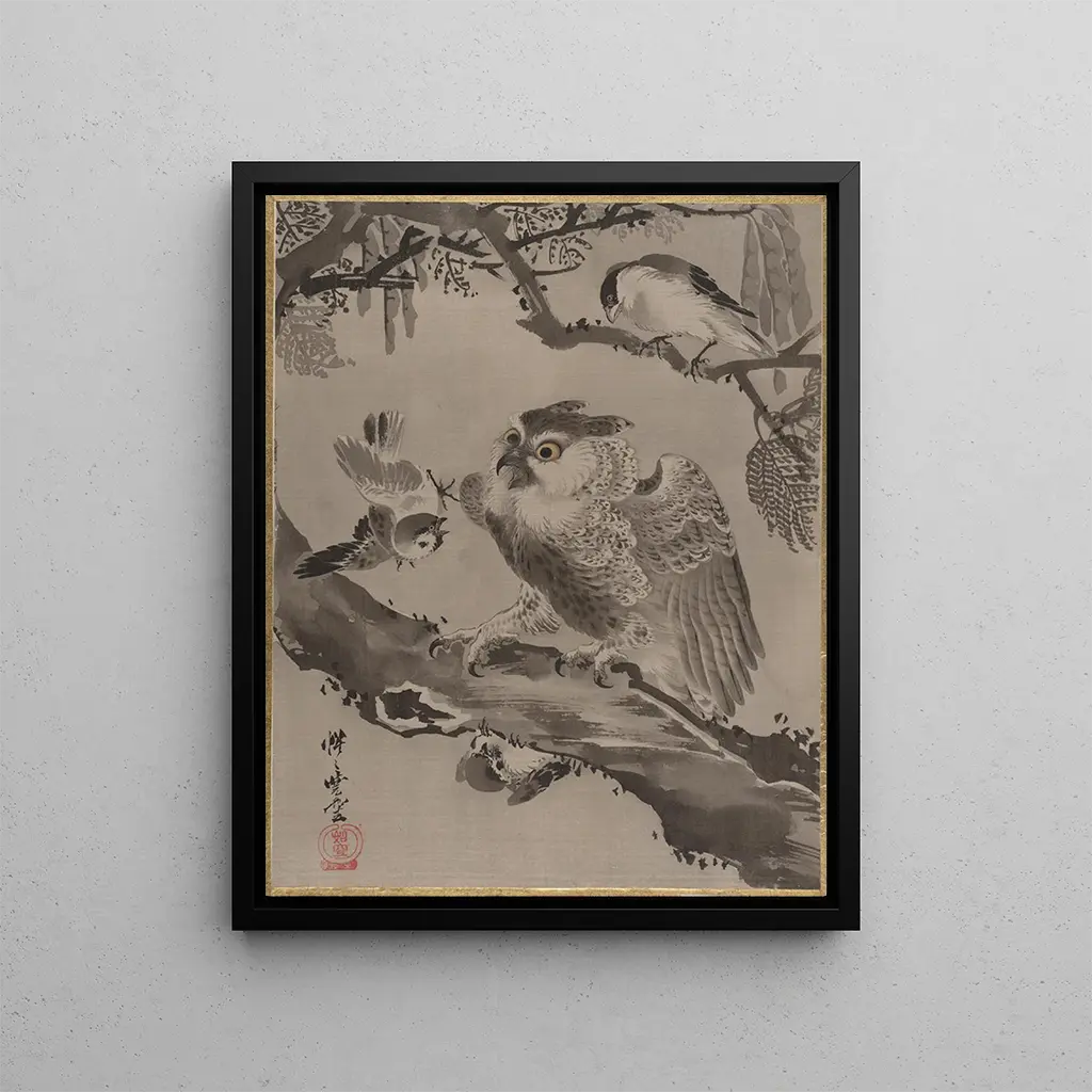 Eine von kleinen Vögeln verspottete Eule - Kawanabe Kyōsai Source: Un hibou moqué par de petits oiseaux - Kawanabe Kyōsai