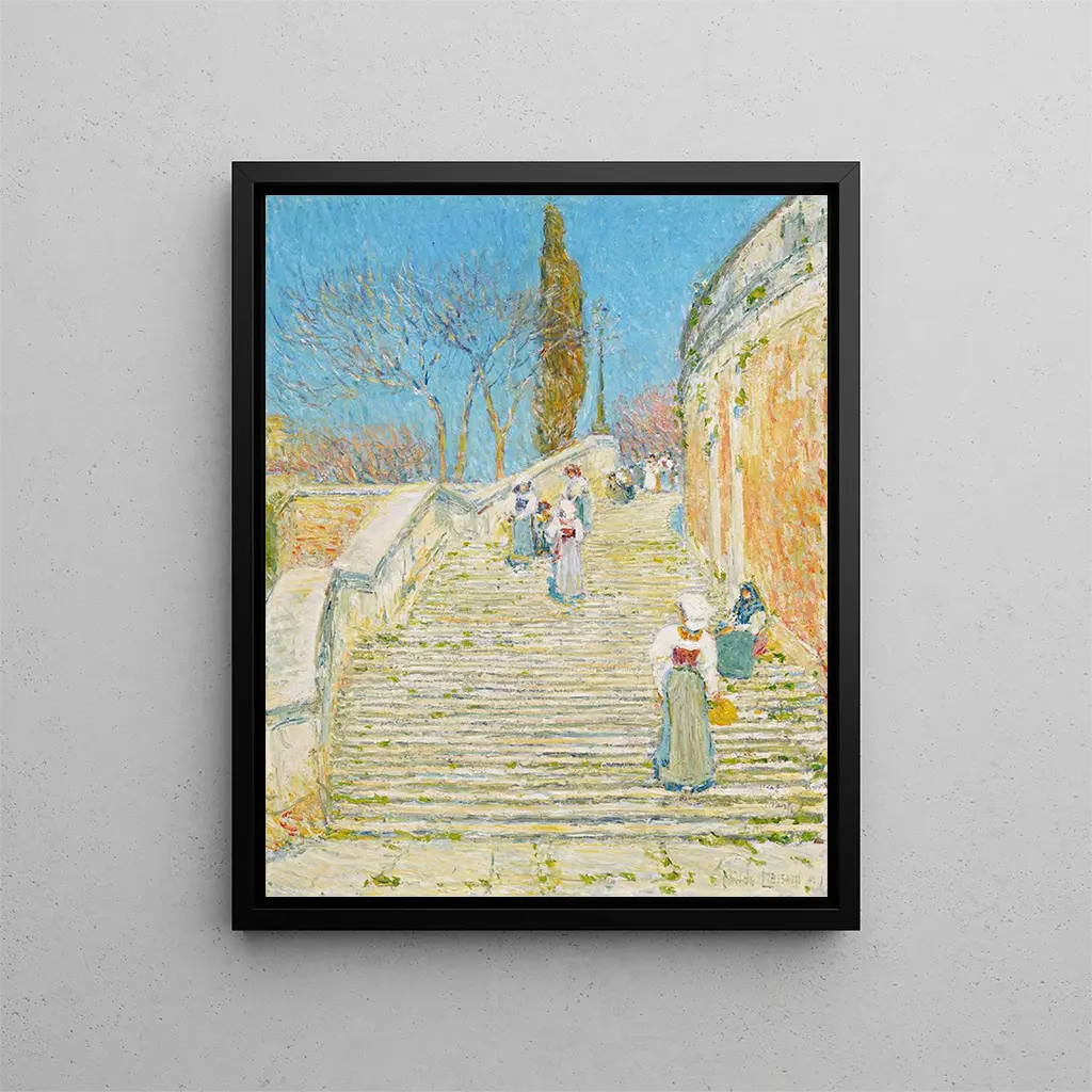 Reproduktion Place d'Espagne à Rome - Childe Hassam – Einführung Die "Place d'Espagne à Rome" von Childe Hassam ist ein Werk, das den einfachen Rahmen eines Gemäldes übertrifft und den Betrachter in eine lebendige und poetische Atmosphäre eintauchen lässt. Dieses Bild, ein Symbol des amerikanischen Impressionismus, evoziert nicht nur die architektonische Schönheit Roms, sondern auch die Lebendigkeit eines pulsierenden Stadtlebens. Die leuchtenden Farben und die dynamischen Pinselstriche laden zu einer sensorischen Erkundung ein, bei der jedes Detail zu atmen scheint vor Licht und Bewegung. Beim Betrachten dieses Werks wird man ins Herz der ewigen Stadt versetzt, wo Kunst und Leben harmonisch verschmelzen. Stil und Einzigartigkeit des Werks Der Stil von Childe Hassam zeichnet sich durch eine mutige Verwendung von Farbe und Licht aus, wodurch eine einzigartige Atmosphäre entsteht, die jedes Bild zu einem immersiven Erlebnis macht. In "Place d'Espagne à Rome" spielt der Künstler mit Kontrasten und chromatischen Harmonien, um die Lebendigkeit der Szene widerzuspiegeln. Die tanzenden Schatten der Bäume, die Reflexionen der Fassaden und die Bewegung der Passanten sind Elemente, die in einem faszinierenden visuellen Tanz verwoben sind. Hassam, Meister des Impressionismus, gelingt es, das Flüchtige einzufangen, den Moment zu fixieren und gleichzeitig ein Gefühl ständiger Bewegung zu vermitteln. Dieses Gemälde ist eine Ode an die flüchtige Schönheit des städtischen Lebens, bei dem jedes Element zu einer ausgewogenen und dynamischen Komposition beiträgt. Der Künstler und sein Einfluss Childe Hassam, eine bedeutende Figur des amerikanischen Impressionismus, hat sich auf der internationalen Kunstbühne durch seinen innovativen Ansatz und seine einzigartige Sensibilität durchgesetzt. Beeinflusst von den großen europäischen Meistern, entwickelte er einen eigenen Stil, der Tradition und Moderne verbindet. Seine Liebe zum Licht und zur Farbe führte ihn dazu, verschiedene Themen zu erforschen, von urbanem Leben bis hin zu ländlichen Landschaften. Hassam spielte auch eine entscheidende Rolle bei der Förderung des Impressionismus in den Vereinigten Staaten und trug zur Entstehung einer neuen Generation von Künstlern bei. Seine Arbeit hat nachhaltigen Einfluss auf die Entwicklung der modernen Kunst gehabt, und sein Erbe inspiriert weiterhin zahlreiche zeitgenössische Schöpfer.