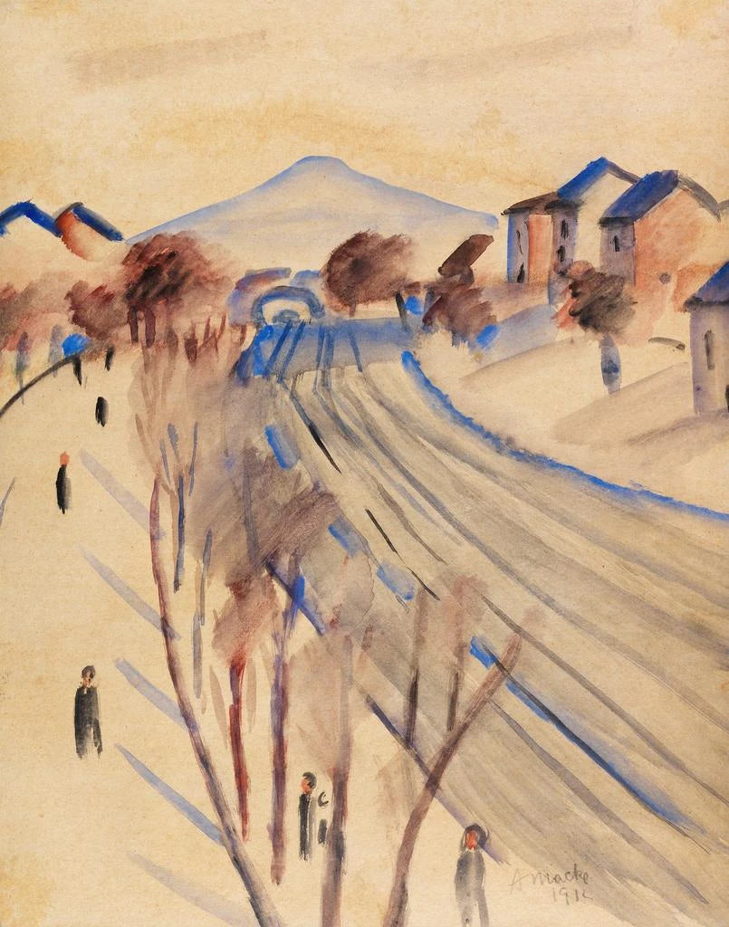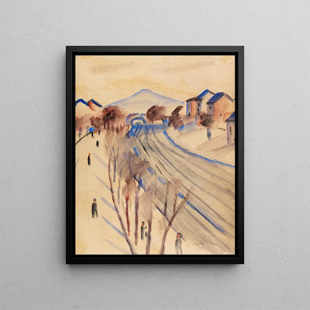 Reproduktion Berg mit Eisenbahnlinien II - August Macke – Fesselnde Einführung In der lebendigen Welt der modernen Kunst hebt sich das Werk "Berg mit Eisenbahnlinien II" von August Macke durch seine Kühnheit und seine Fähigkeit hervor, tiefe Emotionen hervorzurufen. Dieses Gemälde, das sich im expressionistischen Bewegung einordnet, versetzt den Betrachter in eine Landschaft, in der Natur und Industrialisierung in Harmonie koexistieren. Macke, mit seiner leuchtenden Farbpalette und seinem ausgeprägten Gespür für Komposition, gelingt es, das Wesen eines flüchtigen Moments einzufangen, während er gleichzeitig zu einer Reflexion über die Beziehung zwischen Mensch und Umwelt einlädt. Die Reproduktion dieses Werks ist viel mehr als nur ein einfaches Bild; sie ist eine Einladung, eine Welt zu erkunden, in der Schönheit und Modernität aufeinandertreffen. Stil und Einzigartigkeit des Werks "Berg mit Eisenbahnlinien II" zeichnet sich durch seine mutige Verwendung von Farben und Formen aus. Macke, ein wahrer Meister der Farbe, spielt mit lebendigen Tönen, die auf der Leinwand zu tanzen scheinen, und schafft einen beeindruckenden Kontrast zwischen dem üppigen Grün der Hügel und den geometrischen Linien der Eisenbahnlinien. Dieses Gemälde veranschaulicht perfekt die Vision eines Künstlers, der nicht nur die Schönheit der Landschaft ausdrücken möchte, sondern auch die Auswirkungen der Modernität auf sie. Die stilisierten Formen und die dynamischen Perspektiven vermitteln den Eindruck von Bewegung, fast Leben, im Werk. Jedes Element, sei es die wellenförmigen Hügel oder die geschwungenen Schienen, trägt zu einer harmonischen Komposition bei, die den Blick einlädt, jeden Winkel der Leinwand zu erkunden. Der Künstler und sein Einfluss August Macke, eine ikonische Figur des deutschen Expressionismus, prägte seine Zeit durch einen innovativen Ansatz in der Malerei. Geboren 1887, entwickelte er rasch einen Stil, der eine poetische Sensibilität mit einer kritischen Analyse seiner Zeit verbindet. Beeinflusst von Künstlern wie Henri Matisse und Paul Gauguin, experimentierte Macke mit Farbe und Form, um die Realität zu transzendieren und das Wesen menschlicher Emotionen zu berühren. Sein Werk, obwohl manchmal von Melancholie geprägt, ist auch eine Feier des Lebens und der Natur. Durch die Integration alltäglicher Elemente in seine Kompositionen ebnete er den Weg für eine neue Art, die Welt wahrzunehmen, was ihn zu einem
