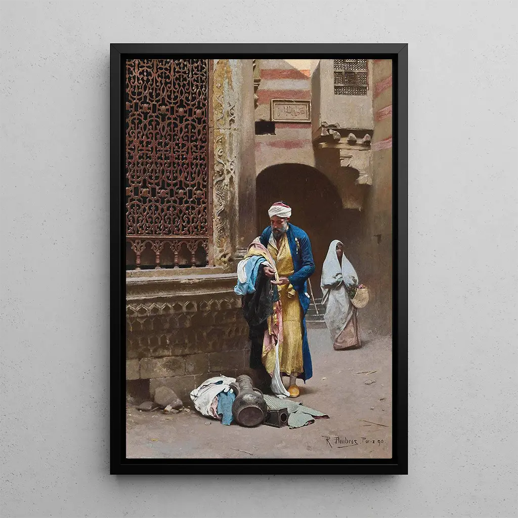 Raphael von Ambros, österreichischer Maler des 19. Jahrhunderts, ist bekannt für seine Werke, die Szenen des orientalischen Lebens darstellen. Beeinflusst von seinen Reisen und dem Exotismus der Kulturen, die er begegnete, konnte er Momente des Lebens mit bemerkenswerter Präzision festhalten. Sein Stil, geprägt von lebendigem Realismus, zeugt vom wachsenden Interesse Europas am Orient zu dieser Zeit. Die Werke von von Ambros, darunter Un marchand du Caire, sind wertvolle Zeugnisse einer Epoche, in der der kulturelle und kommerzielle Austausch florierte und eine nachhaltige Faszination für die Traditionen und Lebensweisen anderer Regionen der Welt widerspiegelte.