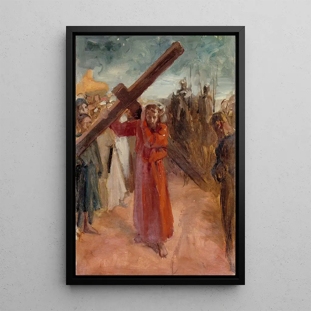 Dans cette œuvre poignante, Albert Edelfelt capture le moment dramatique où le Christ, portant sa croix, avance avec une détermination empreinte de douleur. Les couleurs sombres dominent la toile, créant une atmosphère de gravité et de tension. Les jeux d'ombres et de lumières accentuent les traits du visage du Christ, révélant une humanité profonde et touchante. La composition est soigneusement équilibrée, avec des figures environnantes qui semblent témoigner de cette épreuve, ajoutant à la profondeur émotionnelle de la scène. Edelfelt réussit à transmettre une sensation de mouvement, comme si le spectateur était invité à suivre le Christ sur ce chemin de souffrance.