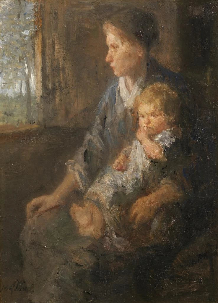 Jozef Israëls, né en 1824, est reconnu pour sa capacité à capturer les nuances de la vie quotidienne à travers un prisme émotionnel. Évoluant dans le courant réaliste, il s'inspire de la vie des paysans et des classes modestes, cherchant à mettre en lumière leur dignité et leur humanité. Influencé par des maîtres comme Rembrandt, il développe un style unique qui marie la lumière et l'ombre pour accentuer les émotions. Son œuvre, dont Sur les genoux de la mère est un parfait exemple, a marqué l'histoire de l'art néerlandais, témoignant d'une époque où l'humanité était au cœur de la création artistique.