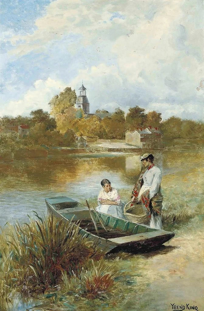 "Sunbury-sur-Thames" est une œuvre qui évoque la beauté tranquille des rives du fleuve Thames. Henry John Yeend King y dépeint une scène paisible, où les reflets de l'eau dansent sous la lumière du soleil. Les bateaux à rames, flottant doucement, ajoutent une dimension vivante à cette composition, tandis que la verdure environnante crée un contraste apaisant avec le bleu du ciel. La technique de King, mêlant réalisme et impressionnisme, donne vie à cette scène bucolique, invitant le spectateur à ressentir la douceur d'une journée au bord de l'eau.