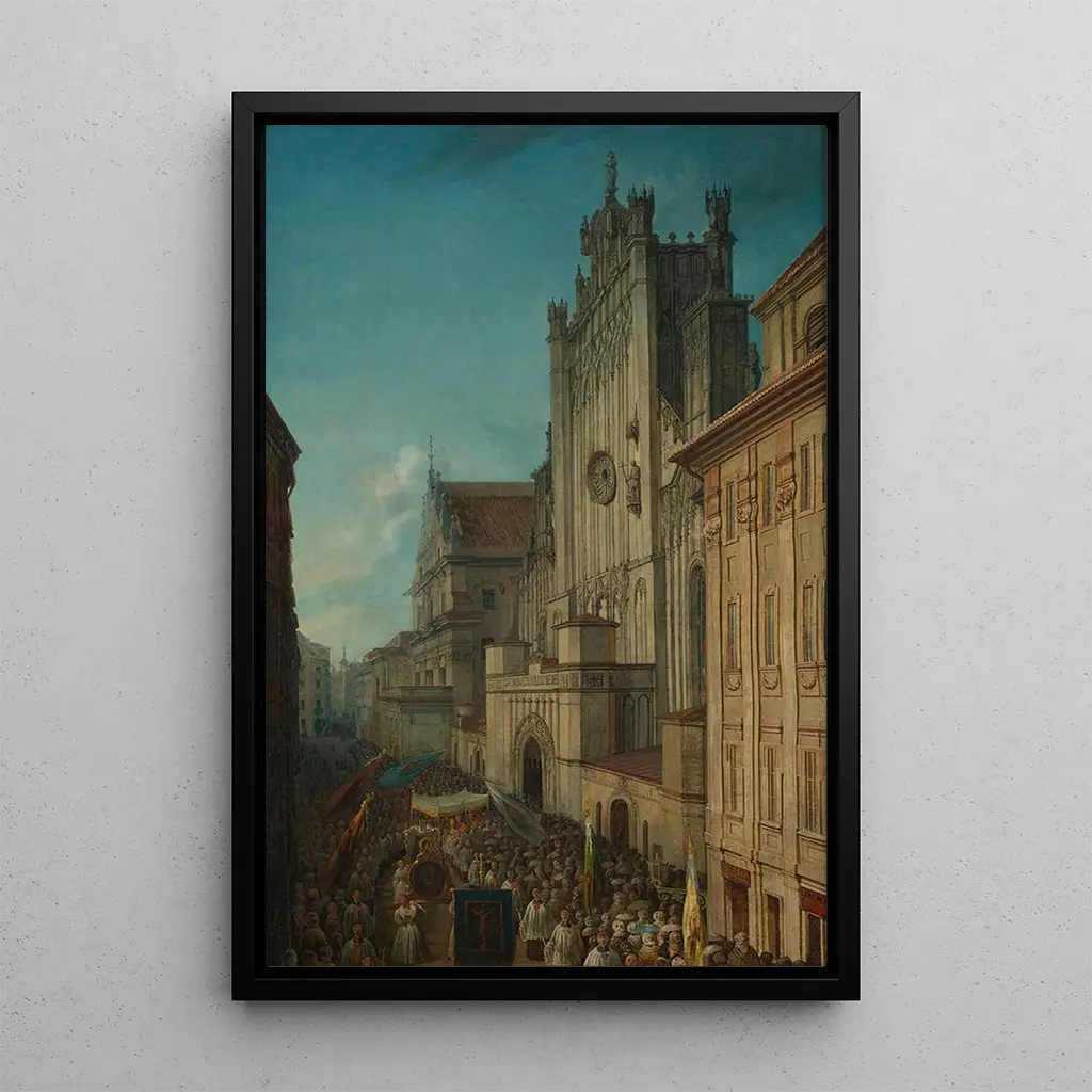 Rue Świętojańska pendant la procession du Corpus Christi : une scène vivante de dévotion La toile Rue Świętojańska pendant la procession du Corpus Christi, réalisée par Jan Seydlitz, capture l'effervescence d'un moment de ferveur religieuse. Les couleurs vives et les mouvements dynamiques des personnages plongent le spectateur dans l'ambiance festive de cette procession. Les détails architecturaux des bâtiments environnants ajoutent une profondeur à la composition, tandis que la lumière joue sur les visages des participants, révélant une palette riche et chaleureuse. Cette œuvre évoque non seulement une célébration religieuse, mais aussi un moment de communion collective, où la foi et la culture se rencontrent. Jan Seydlitz : un témoin de la vie urbaine au XIXe siècle Jan Seydlitz, peintre polonais du XIXe siècle, est reconnu pour sa capacité à immortaliser des scènes de la vie quotidienne et des événements culturels. Son style, influencé par le réalisme, se distingue par une attention particulière aux détails et une représentation fidèle des émotions humaines. Seydlitz a su capturer l'essence de son époque, et ses œuvres reflètent les traditions et les coutumes de la Pologne de son temps. La toile Rue Świętojańska pendant la procession du Corpus Christi est un exemple parfait de son talent à illustrer la vie urbaine et les moments de partage communautaire. Une acquisition décorative aux multiples atouts La reproduction de Rue Świętojańska pendant la procession du Corpus Christi est un ajout idéal à votre décoration intérieure, que ce soit dans un salon, un bureau ou une salle de prière. Sa qualité d'impression et sa fidélité aux couleurs originales en font un tableau captivant qui attire l'attention. En intégrant cette toile dans votre espace, vous apportez une touche d'histoire et de culture, tout en créant une atmosphère chaleureuse et accueillante. Cette œuvre, riche en détails et en émotions, devient un véritable point de rencontre entre le passé et le présent, enrichissant ainsi votre environnement quotidien.