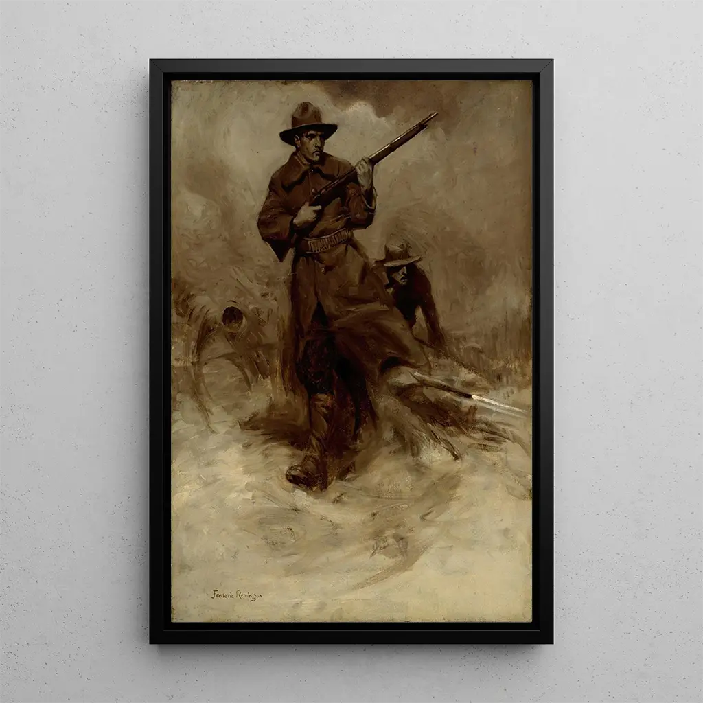 La reproduction de Soldats de la guerre hispano-américaine en action dépeint une scène dynamique et chargée d'émotion, où des soldats se battent avec bravoure. Les couleurs sombres et les contrastes saisissants accentuent la tension du moment, tandis que les détails des uniformes et des expressions des personnages ajoutent une profondeur dramatique à l'œuvre. La technique de peinture utilisée par Gilbert Gaul, avec ses coups de pinceau énergiques, transmet une sensation de mouvement et d'urgence, plongeant le spectateur au cœur de l'action militaire.