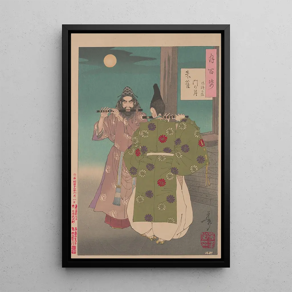 "Lune de la porte Suzaku" est une œuvre emblématique de Tsukioka Yoshitoshi, qui capture la magie d'une nuit illuminée par la lune. La composition présente une scène délicate où la lumière argentée se reflète sur les éléments naturels, créant une atmosphère de rêve et de sérénité. Les couleurs douces et les détails minutieux témoignent de la maîtrise de l'artiste dans l'art de l'estampe ukiyo-e. Ce tableau évoque non seulement la beauté de la nature, mais aussi un sentiment de paix intérieure, invitant le spectateur à se perdre dans la contemplation de cette scène nocturne.