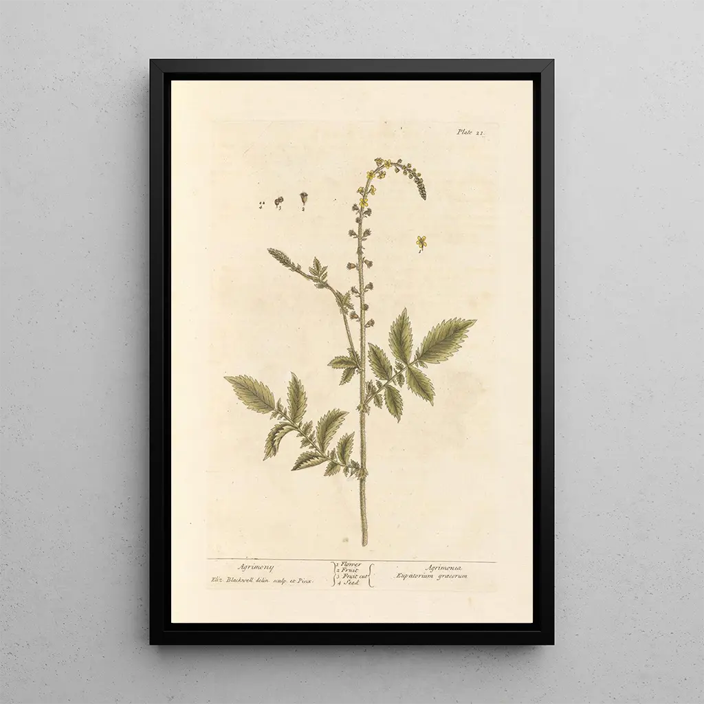 L'œuvre "Aigremoine" d'Elizabeth Blackwell est une illustration captivante qui met en lumière cette plante aux fleurs dorées. Avec des détails précis et une palette de couleurs éclatantes, Blackwell réussit à transmettre la grâce et la légèreté de l'aigremoine. Les tiges élancées et les petites fleurs en grappes créent une composition harmonieuse, évoquant une atmosphère de fraîcheur et de vitalité. Cette toile, à la fois artistique et scientifique, invite à explorer les merveilles de la nature tout en célébrant la beauté des plantes médicinales.