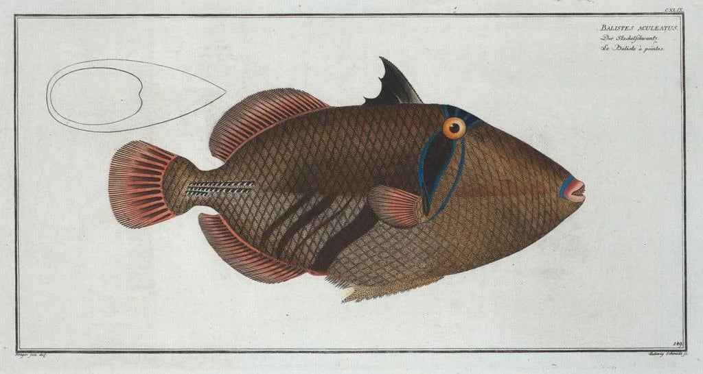 La reproduction de "Balistes aculeatus" nous plonge dans l'univers fascinant des profondeurs marines. Ce tableau, représentant un poisson coloré, met en avant les détails minutieux de l'anatomie de l'animal, ainsi que les nuances vibrantes de ses écailles. Les couleurs éclatantes, allant du vert au bleu en passant par des touches de jaune, évoquent la richesse de la vie sous-marine. Marcus Elieser Bloch, avec sa technique précise et son sens aigu de l'observation, réussit à capturer non seulement l'apparence du poisson, mais aussi son essence, rendant cette œuvre à la fois scientifique et artistique.