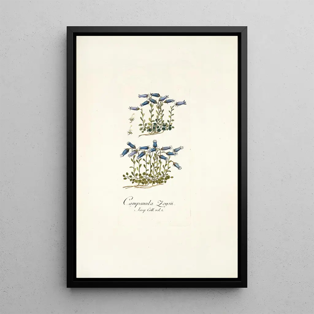 Nikolaus Joseph Freiherr von Jacquin, botaniste et artiste du XVIIIe siècle, a joué un rôle essentiel dans l’illustration scientifique des plantes. Formé à l’Université de Vienne, il a été influencé par les découvertes de son époque et a voyagé à travers l’Europe et les Antilles pour collecter des spécimens. Son œuvre, notamment dans le domaine de la botanique, a contribué à la compréhension des espèces végétales et à leur classification. Campanula zoysii est l’un de ses nombreux travaux qui allient science et art, témoignant de l’importance de la représentation fidèle des plantes dans le contexte de l’essor des sciences naturelles.