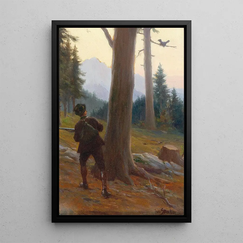 La reproduction Chasse au grand tétras de Josef Straka nous transporte dans un paysage sauvage, où la faune et la flore se rencontrent dans une harmonie délicate. Cette œuvre, riche en détails, capture l'instant précis d'une chasse, révélant la majesté de l'oiseau dans son habitat naturel. Les couleurs terreuses et les nuances de vert évoquent une atmosphère paisible, tandis que la lumière joue sur les plumes du grand tétras, accentuant sa beauté. Straka réussit à créer une scène vivante, presque palpable, qui invite à une réflexion sur la relation entre l'homme et la nature.