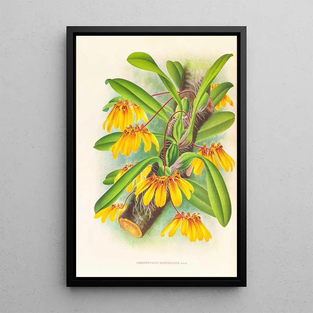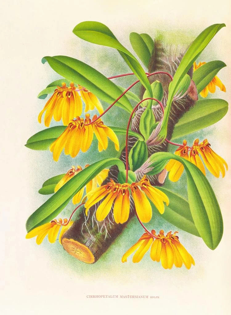 La reproduction de Cirrhopetalum mastersianum est une célébration de la diversité florale. Jean Jules Linden, avec son talent inégalé, parvient à capturer la complexité et la grâce de cette orchidée. Les couleurs riches et les formes délicates des fleurs semblent presque vibrer sur la toile, créant une atmosphère vivante et dynamique. La technique de peinture utilisée par Linden, mêlant aquarelle et détails minutieux, permet de rendre hommage à la beauté naturelle tout en offrant une expérience visuelle immersive.