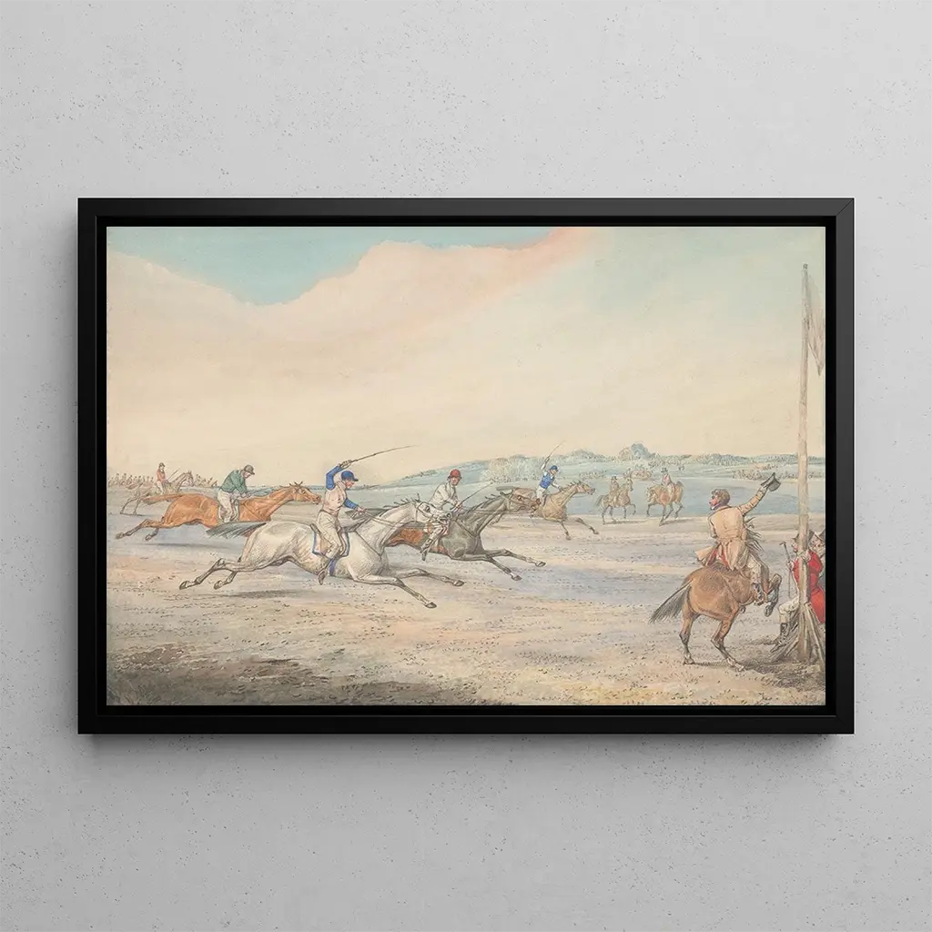 Course d'obstacles La fin : un moment suspendu dans le temps La toile "Course d'obstacles La fin" d'Henry Thomas Alken capture un instant de tension et d'excitation, où chevaux et cavaliers se livrent à une compétition acharnée. Les couleurs vives et dynamiques, mêlant des teintes de vert, de brun et d'or, évoquent la nature environnante tout en mettant en valeur la puissance des animaux. La technique de l'artiste, qui combine habilement le réalisme et le mouvement, crée une atmosphère palpable, presque électrique. Chaque détail, des expressions des cavaliers aux mouvements des chevaux, est soigneusement rendu, invitant le spectateur à plonger dans cette scène de compétition. Henry Thomas Alken : le maître de la scène équestre Henry Thomas Alken, peintre britannique du XIXe siècle, est reconnu pour ses œuvres centrées sur les courses de chevaux et les scènes de chasse. Influencé par le mouvement romantique, Alken a su capturer l'esprit de son époque, où les activités équestres étaient au cœur de la vie aristocratique. Sa carrière prolifique lui a permis de devenir un des artistes les plus appréciés de son temps, avec une attention particulière portée aux détails et à la représentation réaliste des chevaux. Ses œuvres, souvent empreintes d'une certaine nostalgie, témoignent d'une passion pour le monde équestre et d'une maîtrise technique impressionnante. Une acquisition décorative aux multiples atouts La reproduction de "Course d'obstacles La fin" est une pièce décorative idéale pour tout espace, qu'il s'agisse d'un salon, d'un bureau ou d'une chambre. Sa qualité d'impression et sa fidélité à l'œuvre originale en font un choix attrayant pour les amateurs d'art et les passionnés d'équitation. En intégrant ce tableau dans votre décoration, vous apportez une touche d'élégance et de dynamisme à votre intérieur. L'attrait esthétique de cette toile saura captiver vos invités et enrichir votre environnement, tout en évoquant l'excitation des courses de chevaux.