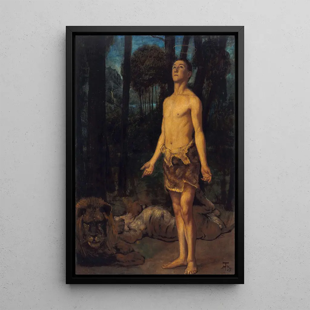 Hans Thoma, peintre allemand du XIXe siècle, est reconnu pour son style unique qui mêle le symbolisme et le romantisme. Influencé par les mouvements artistiques de son époque, il a su capturer des thèmes spirituels et mythologiques avec une grande sensibilité. Thoma a été actif durant une période de bouleversements sociaux et politiques en Europe, ce qui a façonné son approche artistique. Ses œuvres, souvent inspirées par la nature et les récits bibliques, témoignent d'une quête de beauté et de vérité. "Daniel dans la fosse aux lions" s'inscrit parfaitement dans cette tradition, offrant une réflexion sur la foi et la résilience humaine.