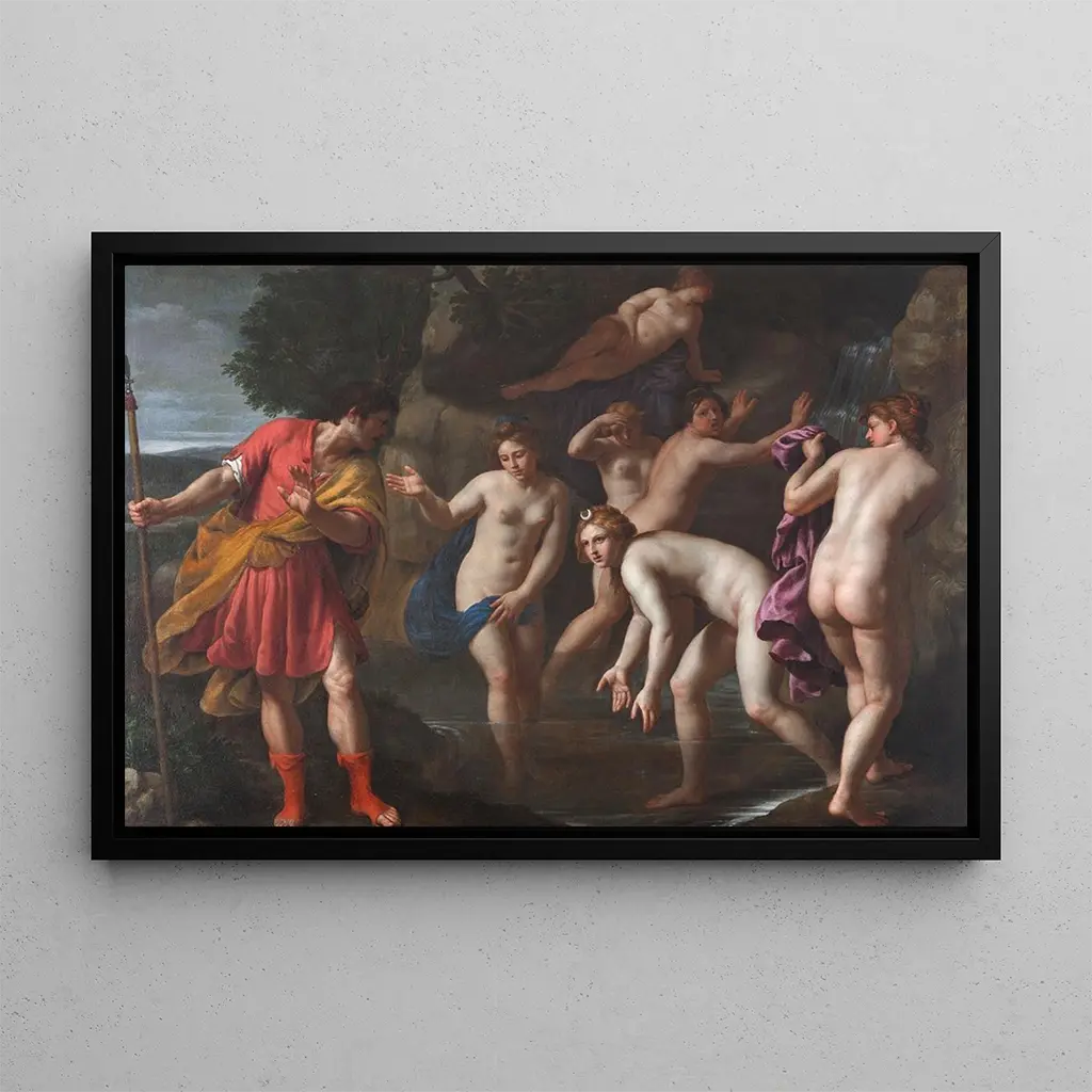 La reproduction de "Diane et Actéon" d'Alessandro Turchi illustre un moment intense du mythe grec, où la déesse de la chasse, Diane, se retrouve face à Actéon, un chasseur qui l'a surprise. La composition dynamique, accentuée par des couleurs vives et contrastées, transmet une émotion palpable. Les figures sont rendues avec une grande expressivité, capturant l'instant de surprise et de tension. La technique de Turchi, qui mêle habilement le clair-obscur et le mouvement, donne vie à cette scène mythologique, plongeant le spectateur dans un récit riche en symbolisme.