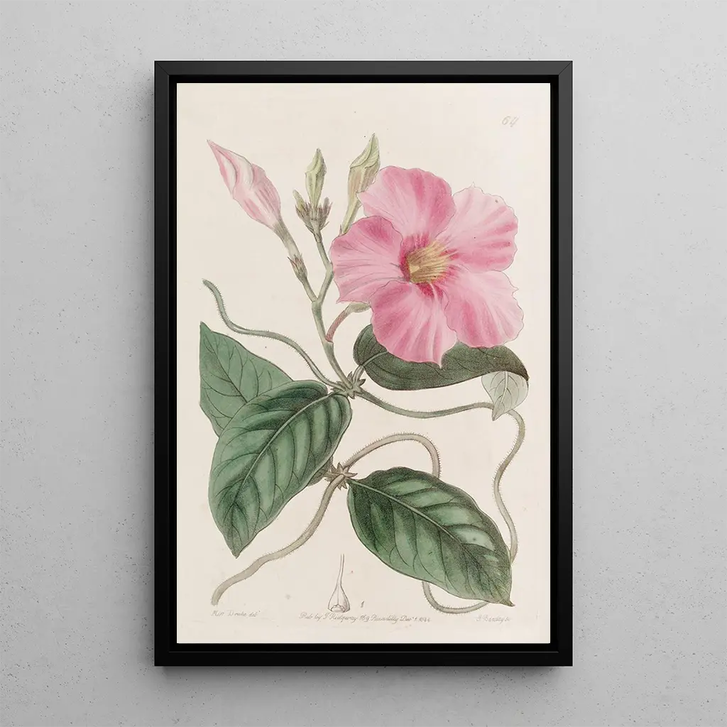 La reproduction du tableau "Dipladénia à nœuds" de Sydenham Edwards nous plonge dans un univers vibrant où la nature s’épanouit avec éclat. Les couleurs chatoyantes des fleurs, allant du rose au violet, se mêlent harmonieusement, créant une atmosphère joyeuse et dynamique. La technique de l’aquarelle, utilisée avec finesse, permet de capturer la délicatesse des pétales et la richesse des feuillages. Chaque détail est soigneusement rendu, invitant le spectateur à s’approcher pour admirer la beauté de cette plante grimpante. La composition, à la fois équilibrée et audacieuse, évoque une sensation de légèreté et de fraîcheur, comme une brise printanière.