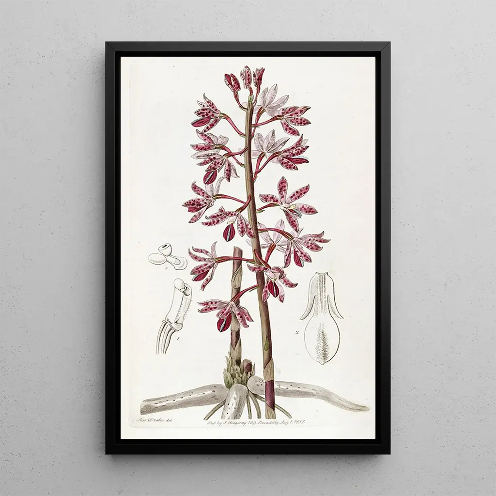 Le tableau 'Dipodium tacheté' de Sydenham Edwards nous plonge dans un univers floral vibrant. Les couleurs éclatantes, allant du violet au blanc, se mêlent harmonieusement, créant une atmosphère à la fois délicate et envoûtante. La technique de l’aquarelle, utilisée avec finesse, permet de rendre la transparence des pétales et la richesse des détails. Chaque fleur semble prendre vie, invitant le spectateur à s'approcher pour admirer la minutie de chaque coup de pinceau. Cette œuvre, à la fois scientifique et artistique, nous transporte dans un jardin luxuriant, où la nature s’exprime dans toute sa splendeur.
