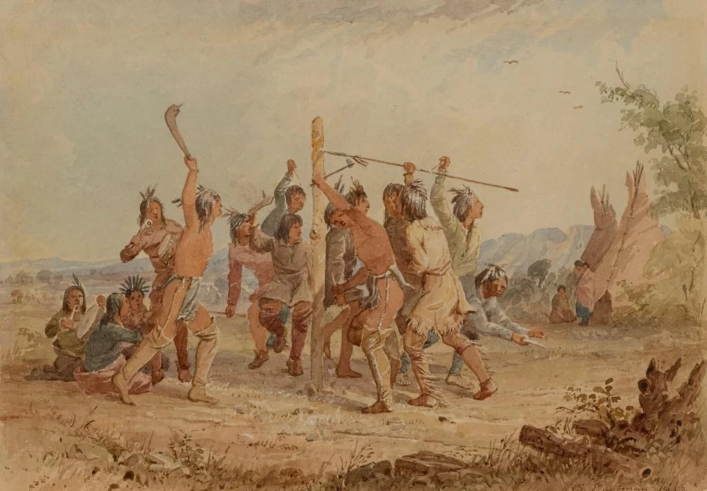 L'œuvre "Frapper le poteau" de Seth Eastman capture un moment dynamique où la force et la détermination se rencontrent. Les couleurs terreuses et les nuances de bleu évoquent une atmosphère à la fois réaliste et vibrante. La technique de l'artiste, qui mêle habilement l'aquarelle et l'huile, donne vie à la scène, permettant au spectateur de ressentir l'énergie qui émane des personnages. Chaque détail, des expressions faciales aux mouvements des corps, est soigneusement rendu, créant une immersion totale dans cet instant de l'histoire.
