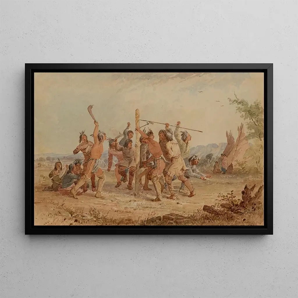 Seth Eastman, né en 1808, est un artiste américain reconnu pour ses représentations de la vie et des paysages des peuples autochtones. Actif durant une période où l'expansion vers l'ouest redéfinissait le paysage culturel américain, Eastman a été influencé par ses voyages et ses interactions avec les tribus indiennes. Son style, ancré dans le réalisme, témoigne d'une volonté de documenter la vie quotidienne et les traditions des peuples qu'il a rencontrés. Son œuvre "Frapper le poteau" s'inscrit dans cette démarche, offrant un aperçu précieux de l'époque et des cultures qu'il a cherché à représenter.