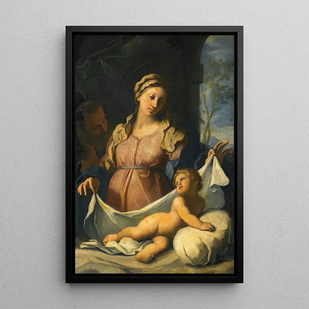 La reproduction de La Sainte Famille de Gian Domenico Cerrini dégage une atmosphère de sérénité et de dévotion. Les personnages, délicatement disposés, sont baignés dans une lumière douce qui souligne les nuances chaudes des couleurs. La technique de Cerrini, mêlant le clair-obscur et une attention minutieuse aux détails, crée une profondeur émotionnelle. Les expressions des visages, empreintes de tendresse, invitent à une contemplation silencieuse, tandis que les drapés des vêtements ajoutent une dimension tactile à l'œuvre. Cette toile, véritable ode à la famille sacrée, évoque des sentiments de paix et de protection.