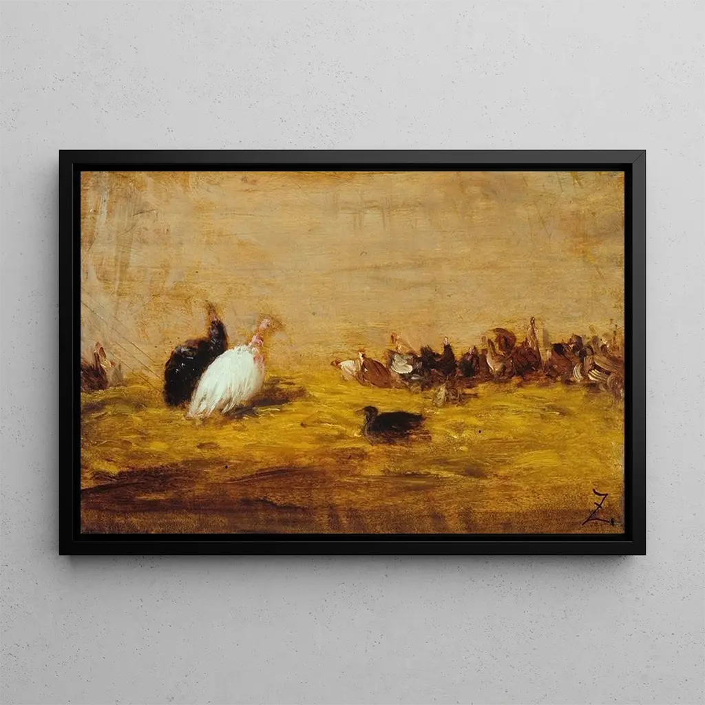 Les Dindons : une scène vivante de la nature Dans cette œuvre vibrante, Félix Ziem nous plonge au cœur d'une nature animée où les dindons, majestueux et colorés, se déplacent avec grâce. La composition est soigneusement orchestrée, mêlant des teintes chaudes de terre et des éclats de couleurs vives qui évoquent la richesse de la faune. La technique picturale, caractéristique de Ziem, combine des coups de pinceau fluides et des détails précis, créant une atmosphère à la fois sereine et dynamique. Ce tableau invite à une contemplation attentive, où chaque élément contribue à l'harmonie générale de la scène. Félix Ziem : un maître de la lumière et de la couleur Félix Ziem, peintre français du XIXe siècle, est reconnu pour ses paysages et ses marines, mais il excelle également dans la représentation de la faune. Influencé par le romantisme et le réalisme, il a su capturer la beauté de la nature avec une sensibilité unique. Sa carrière, marquée par des voyages en Italie et en Orient, lui a permis d'enrichir son vocabulaire pictural. Ziem a laissé un héritage durable, inspirant de nombreux artistes à explorer les nuances de la lumière et de la couleur dans leurs œuvres. Son approche novatrice a fait de lui une figure incontournable de son époque. Une acquisition décorative aux multiples atouts La reproduction du tableau Les Dindons est une pièce décorative idéale pour embellir votre salon, bureau ou chambre. Sa qualité d'impression garantit une fidélité remarquable aux détails et aux couleurs de l'œuvre originale, apportant une touche d'élégance à votre intérieur. Ce tableau, avec son attrait esthétique indéniable, suscite l'admiration et la curiosité, tout en offrant une atmosphère chaleureuse et accueillante. En choisissant cette toile, vous ajoutez non seulement une œuvre d'art à votre collection, mais également un élément de conversation qui enrichit votre espace de vie.