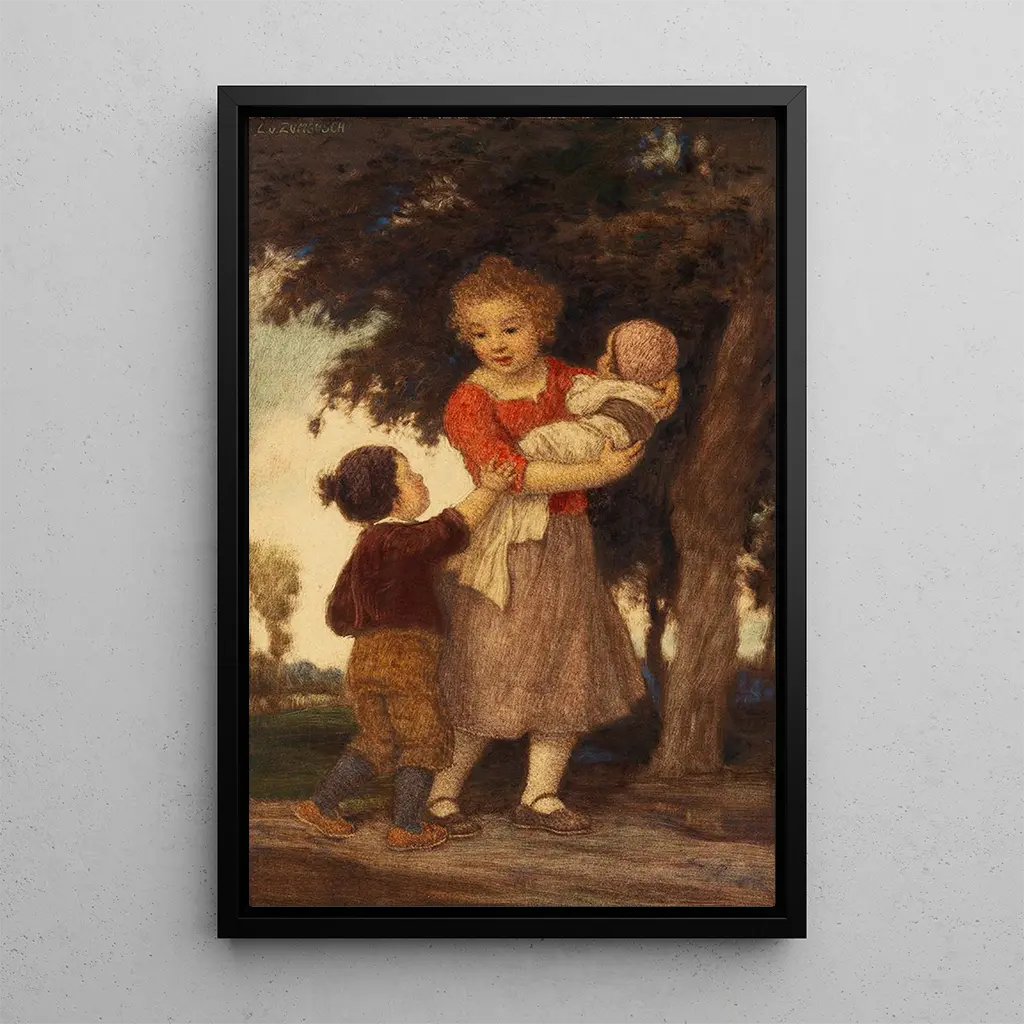 Ludwig von Zumbusch, principalement connu comme sculpteur, a également laissé une empreinte significative dans le monde de la peinture au XIXe siècle. Formé dans un contexte artistique riche, il a su intégrer des éléments de sculpture dans sa peinture, créant des œuvres d'une grande profondeur émotionnelle. "Les trois frères et sœurs" est emblématique de son approche, où la lumière et l'ombre jouent un rôle crucial dans la définition des formes et des expressions. Zumbusch a souvent exploré des thèmes familiaux et sociaux, témoignant de son intérêt pour la condition humaine et les relations interpersonnelles, ce qui confère à son œuvre une dimension universelle.
