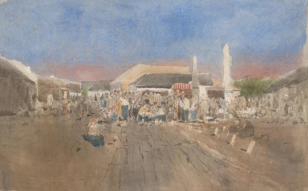 La reproduction de Marché à Szolnok, réalisée par Ladislav Mednyánszky, capture l'effervescence d'un marché animé dans une ville hongroise. Les personnages, habillés de costumes traditionnels, se mêlent dans une danse de couleurs et de mouvements, tandis que les étals débordent de produits locaux. Mednyánszky utilise une palette riche et variée, créant une atmosphère vivante et dynamique. La technique impressionniste de l'artiste permet de ressentir l'énergie du lieu, où chaque détail, des visages aux objets, contribue à l'ensemble. Ce tableau est une véritable fenêtre sur la vie quotidienne du XIXe siècle en Hongrie.