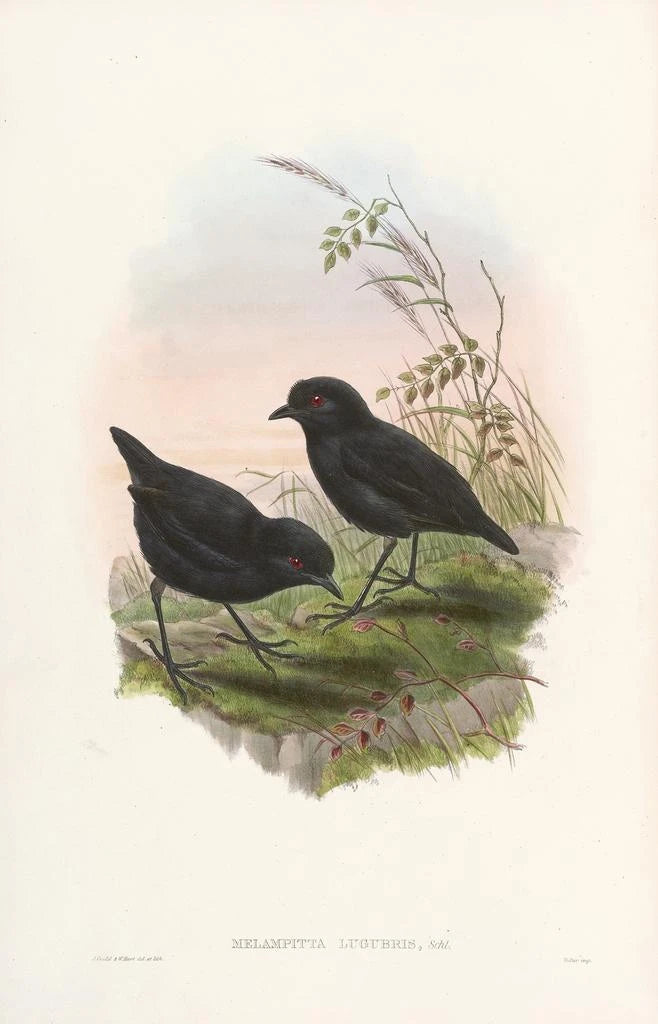 John Gould, célèbre ornithologue et illustrateur britannique, a marqué le XIXe siècle par ses œuvres d’une grande précision scientifique et artistique. Sa passion pour les oiseaux l’a poussé à explorer des contrées lointaines, où il a collecté des spécimens et réalisé des illustrations d'une grande finesse. Influencé par le mouvement romantique, Gould a su allier art et science, rendant ses œuvres à la fois esthétiques et informatives. La Monographie des Pittidae, parmi ses travaux les plus connus, témoigne de son engagement à représenter la biodiversité aviaire avec une attention minutieuse aux détails.