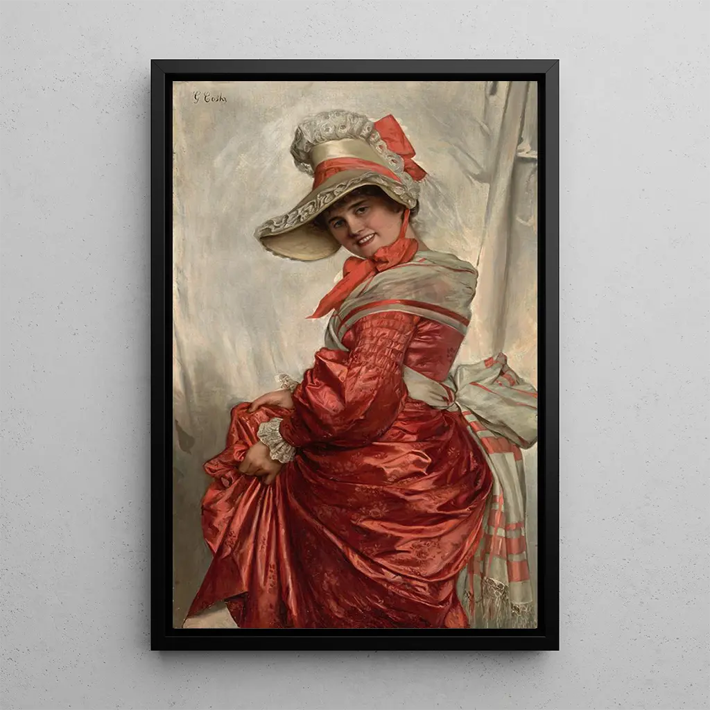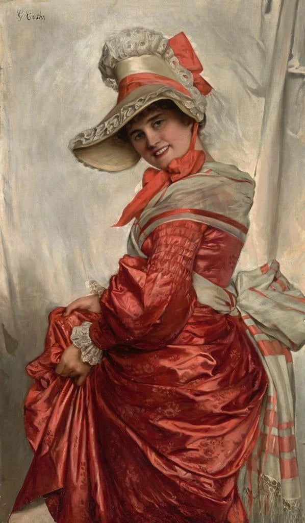 Dans cette œuvre captivante, Giovanni Costa nous plonge dans un univers où la grâce et l'élégance se rencontrent. La composition met en avant une femme vêtue d'une robe somptueuse, dont les couleurs chatoyantes évoquent la lumière d'un après-midi ensoleillé. Les détails minutieux de la texture de la robe et des accessoires ajoutent une dimension tactile à la toile. L'atmosphère est empreinte de sérénité, invitant le spectateur à admirer la beauté intemporelle de la mode et de la féminité. Chaque coup de pinceau semble raconter une histoire, une célébration de l'art de vivre à la fin du XIXe siècle.