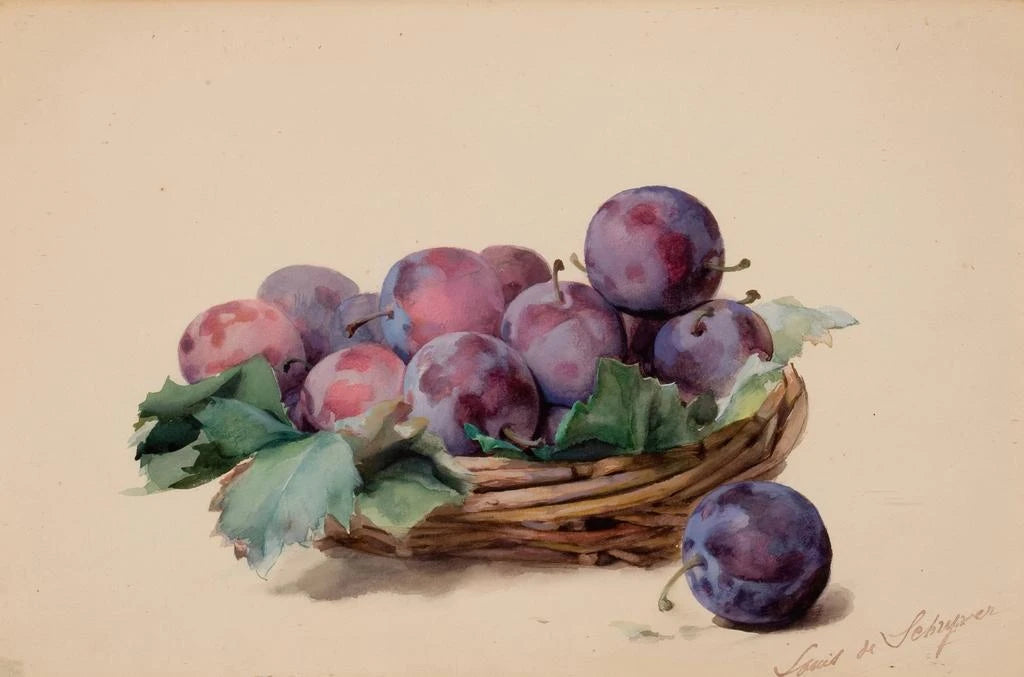 Le Panier de prunes, œuvre de Louis Marie de Schryver, évoque une scène bucolique où les fruits juteux s'entrelacent avec la lumière douce d'un jour d'été. La composition, soigneusement agencée, met en avant des prunes aux couleurs vibrantes, allant du violet profond au jaune doré, créant un contraste saisissant. La technique de Schryver, caractérisée par des coups de pinceau délicats et une attention minutieuse aux détails, confère à l'œuvre une atmosphère chaleureuse et accueillante. Chaque fruit semble presque tangible, invitant le spectateur à apprécier la beauté éphémère de la nature.